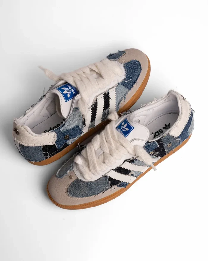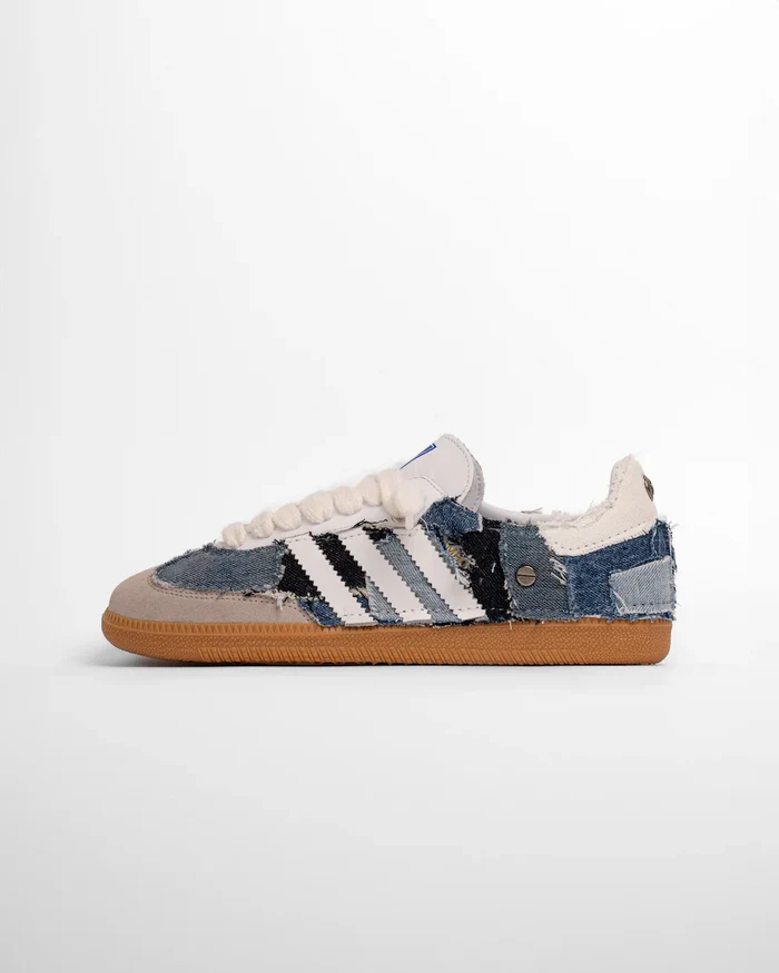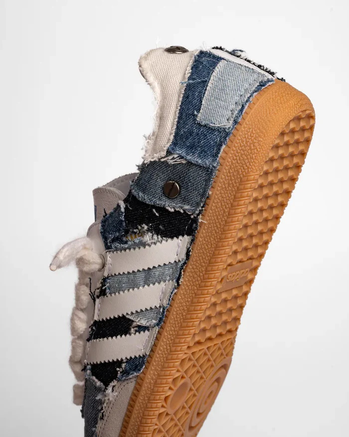 Esta zapatillas de adidas icónica tiene un aspecto contemporáneo en la Kojima personalizada, cubriendo el zapato con parches de mezclilla en diferentes tonos y las rayas en tela de cuero ecológico blanco. La zapatilla personalizada está rematada con tachuelas metálicas planas y cordones de algodón blanco.