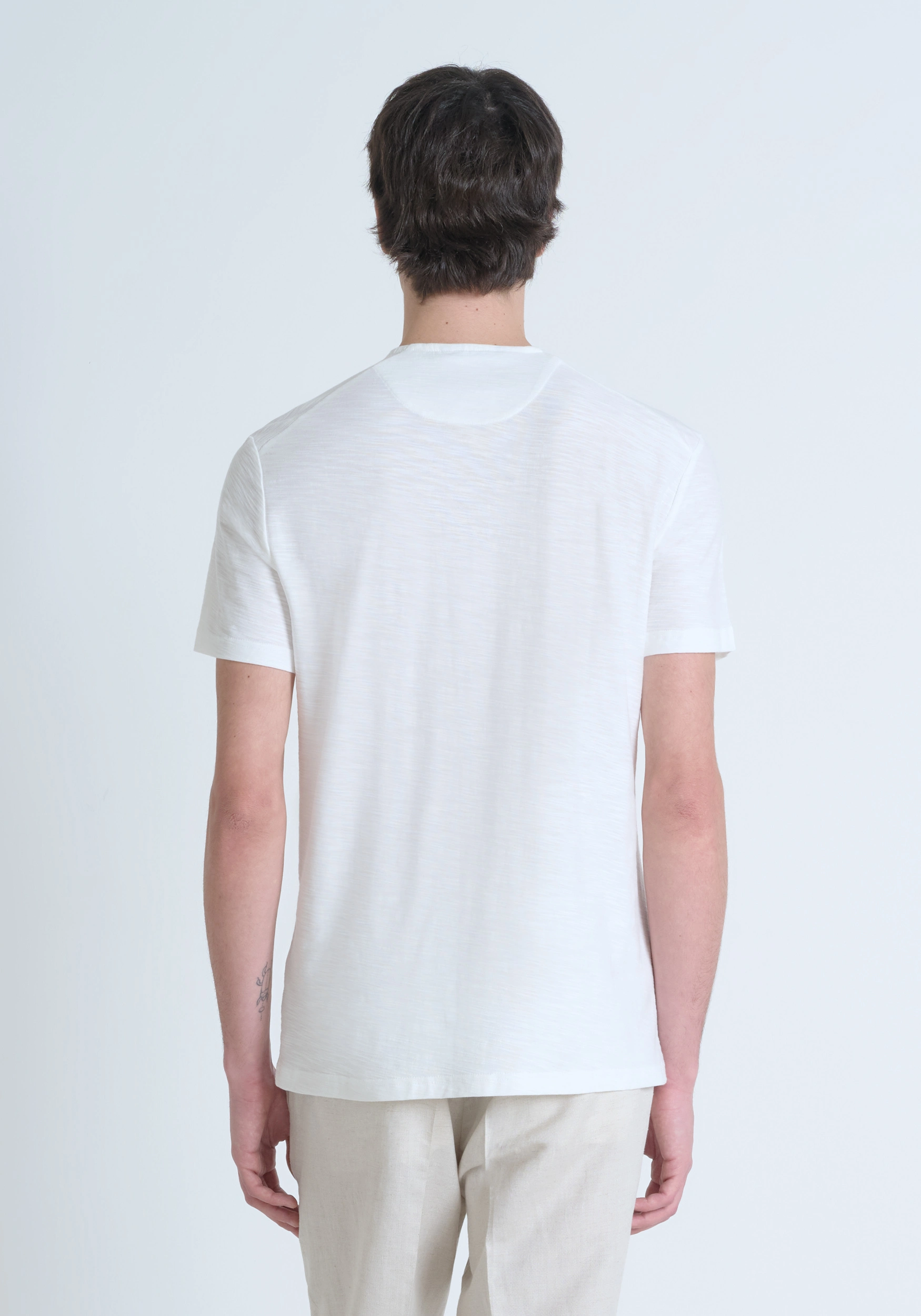 Camiseta de cuello redondo de algodón flameado con corte recto. Cierre de tres botones y logotipo cosido en el pecho. La opción perfecta para tus «looks» informales en los irresistibles colores de la temporada.