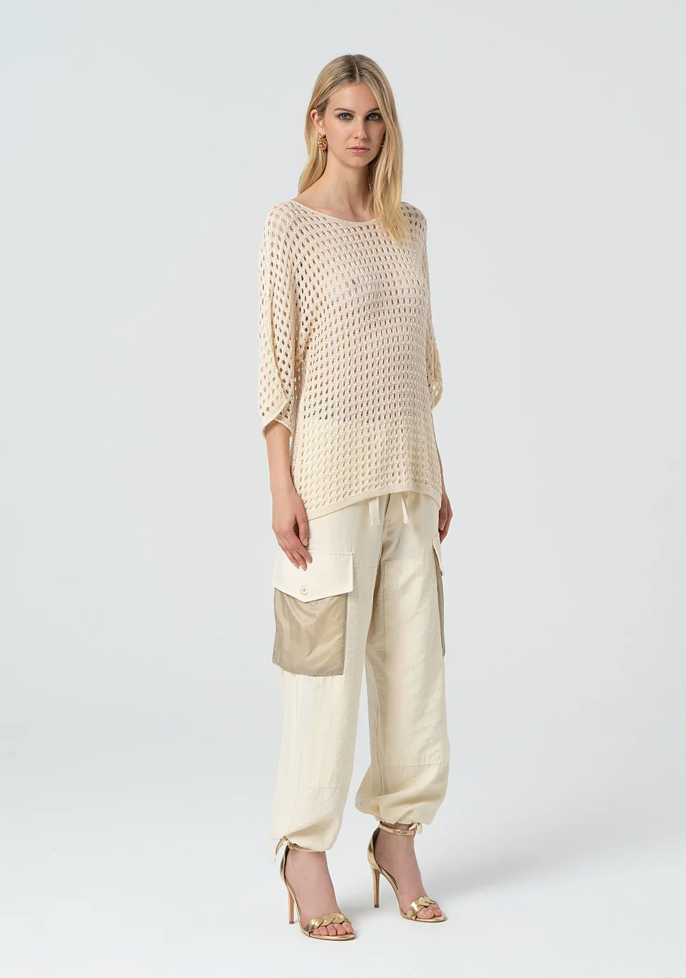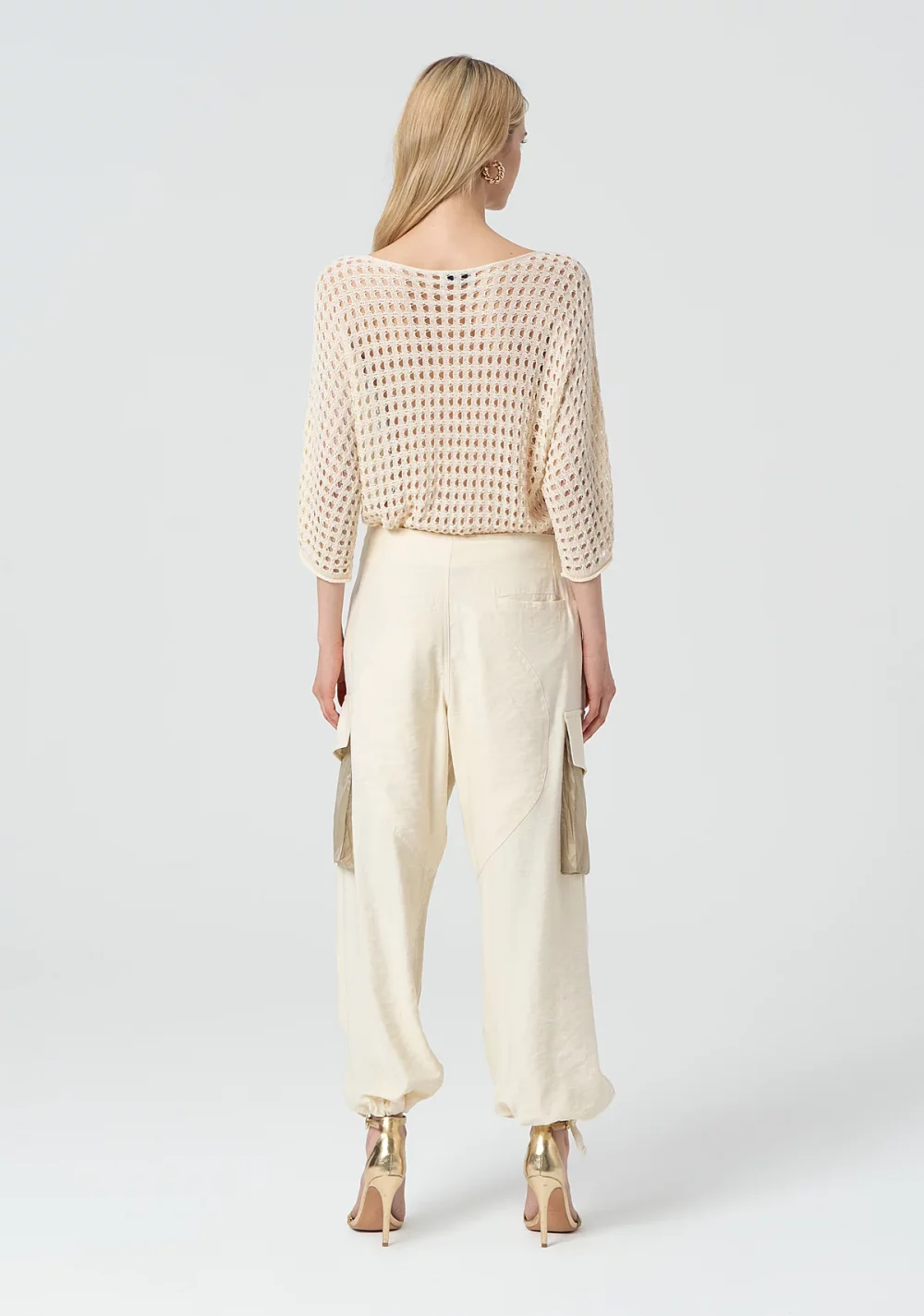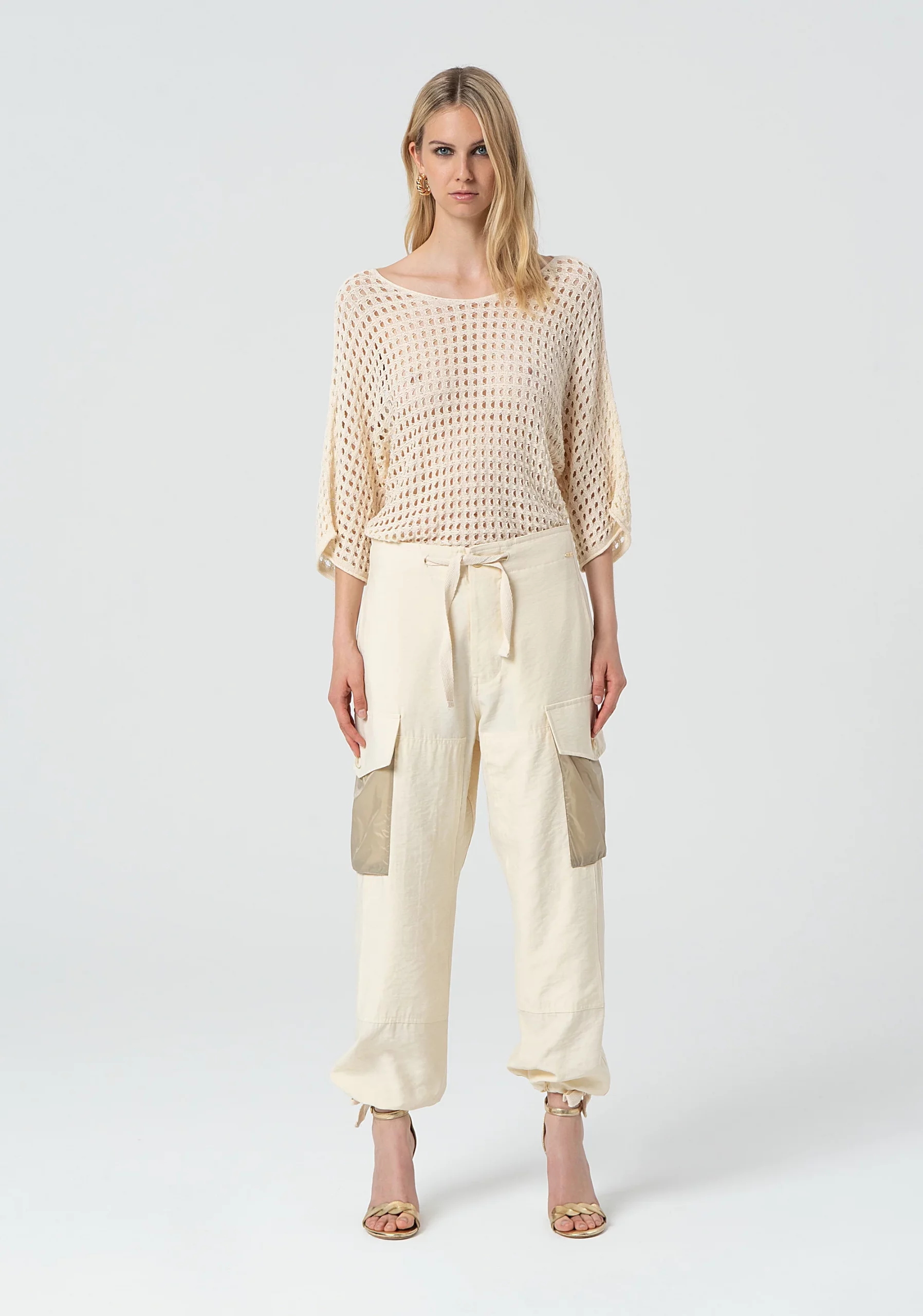 Pantalón cargo confeccionado en viscosa. Talle alto con cinturilla, amplios bolsillos laterales y bajo ajustado con banda elástica