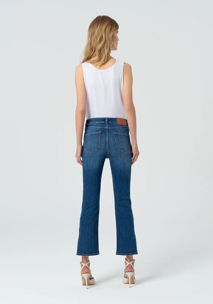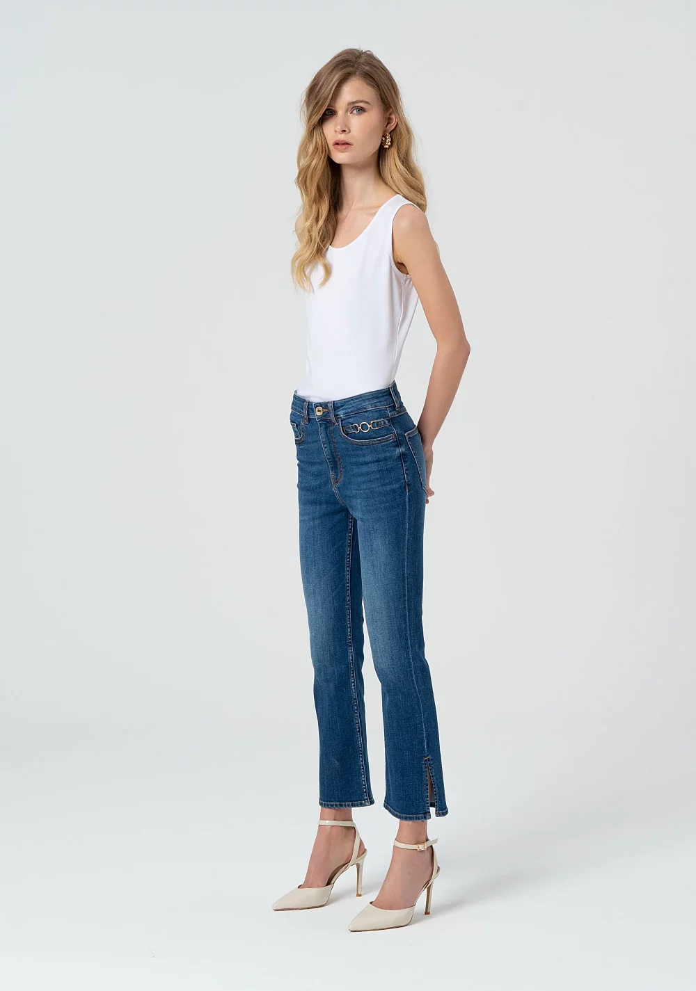 Vaqueros cropped bootcut con efecto push-up, confeccionados en denim con lavado oscuro. Cintura regular, cinco bolsillos, pernera y bajo ajustados con aberturas.