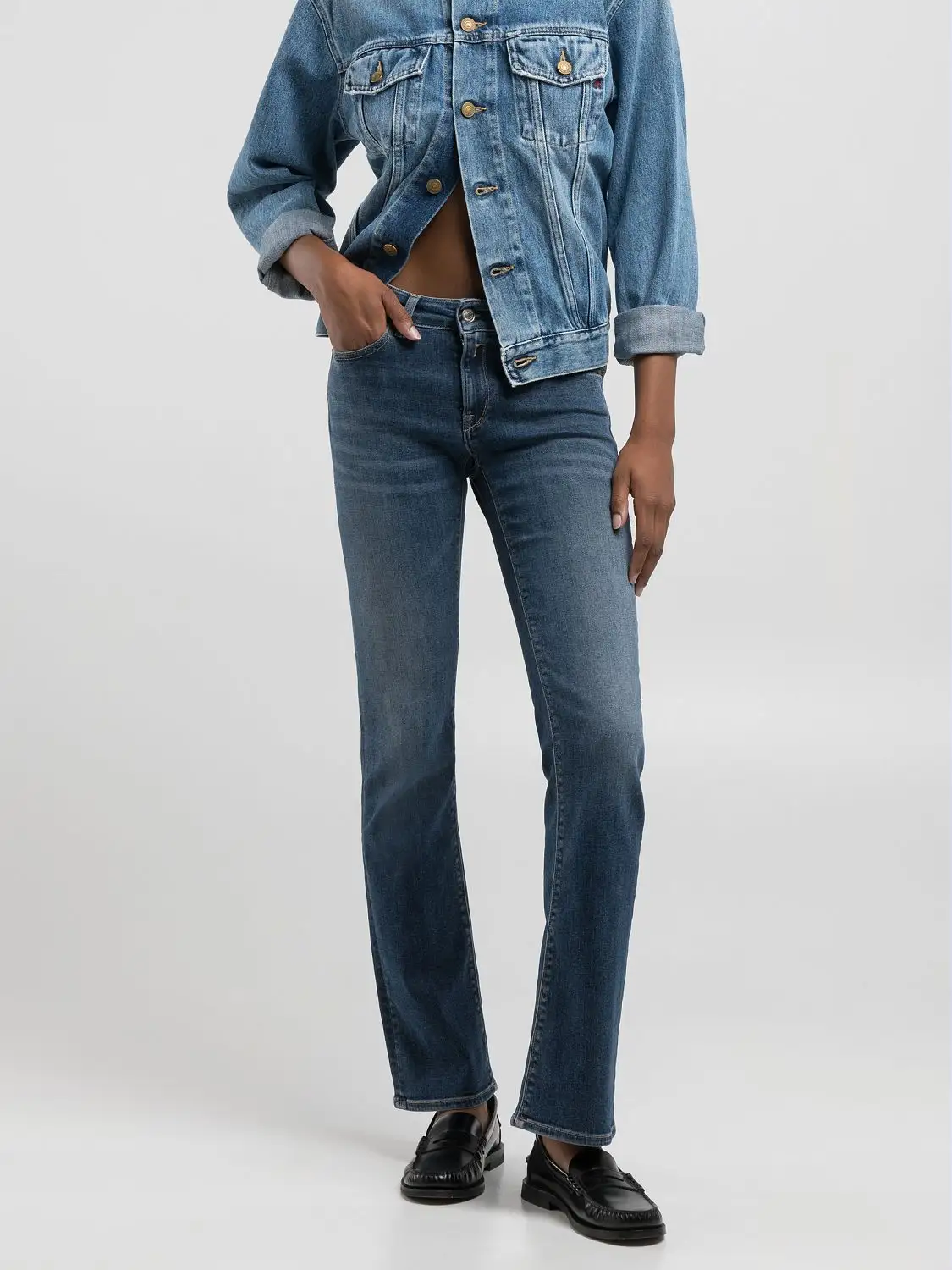 Vaqueros bootcut de cintura regular con pernera ajustada desde la cadera hasta la rodilla y bajo ligeramente acampanado. El modelo está confeccionado en denim power stretch índigo de mezcla de algodón y modal de 11 oz con un tacto especialmente suave, tratado conlavado a la piedra enzimático en un tono oscuro. La prenda de cinco bolsillos también presenta un tratamiento inicial de resinado con efecto 3D y bigotes y lijados realizados a mano que crean contrastes en las zonas de desgaste. El icónico pespunte de ala de gaviota caracteriza el quinto bolsillo y los bolsillos traseros, uno de los cuales lleva el bordado R, mientras que en uno de los bolsillos delanteros hay una pequeña aplicación personalizada. Cierre con botón y cremallera.