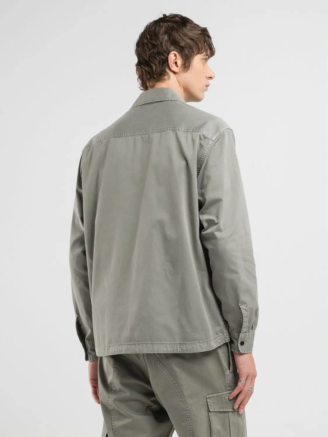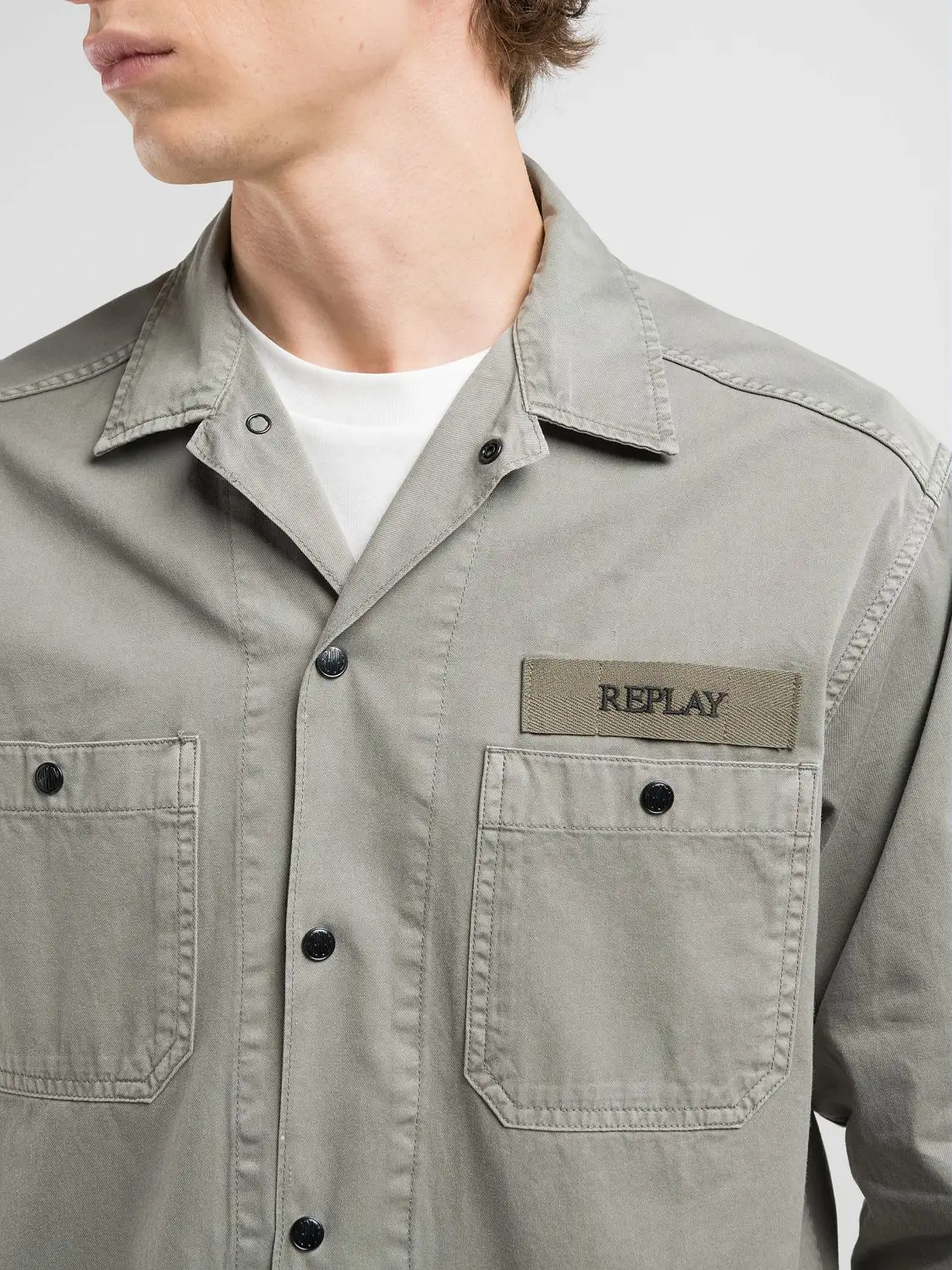Camisa de corte relajado confeccionada en sarga de algodón suave y ligera teñida en prenda. El modelo de manga larga se caracterizapor dos bolsillos delanteros con botones a presión con el logotipo, que también están presentes en el cierre delantero y en los puños. La etiqueta Replay en el pecho completa la prenda.