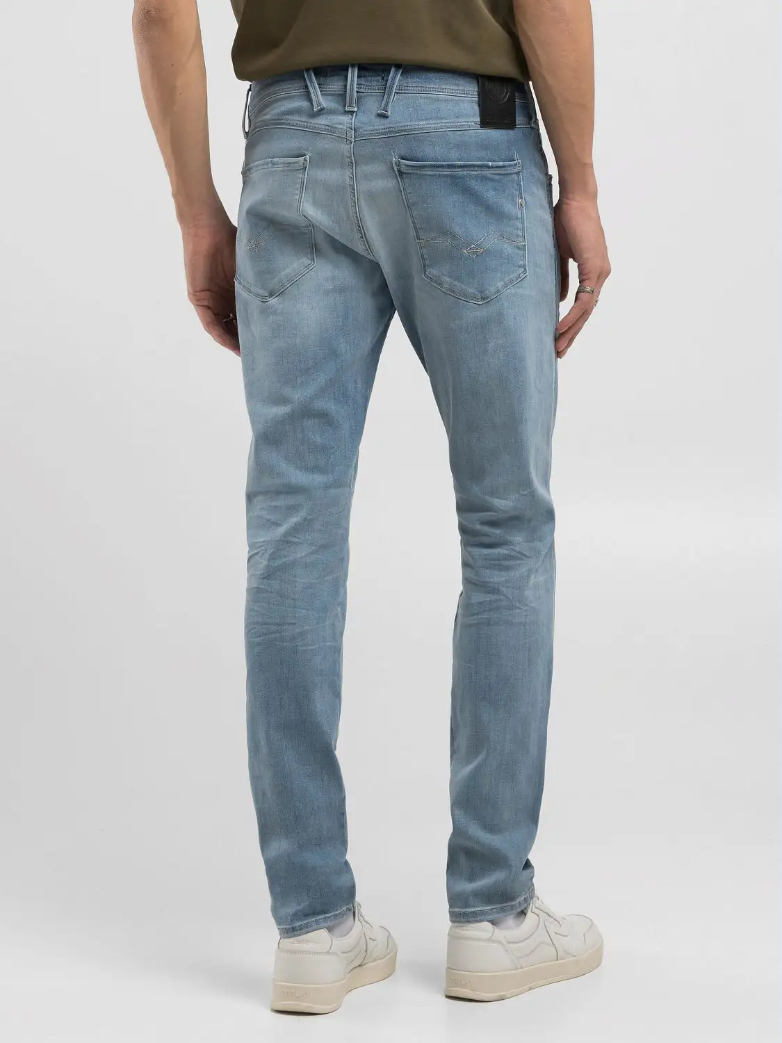 Vaqueros slim fit de cintura regular y pernera recta con un corte cómodo y ligero. El modelo está confeccionado en denim azul oscuro índigo de mezcla de algodón elástico Hyperflex Reform Bio de 11,5 onzas, con tratamiento de lavado a la piedra, tono de lavado azul grisáceo y secado final en maniquí. Este vaquero de hombre con bigotes y lijado presenta abrasiones en los bordes de los bolsillosy en los bajos de las perneras, que crean ligeros contrastes de color en las zonas de desgaste. El icónico pespunte en forma de alade gaviota caracteriza el quinto bolsillo y los bolsillos traseros, uno de los cuales lleva el remache R, mientras que uno de los bolsillos delanteros presenta una pequeña aplicación personalizada. Cierre con botón y cremallera.