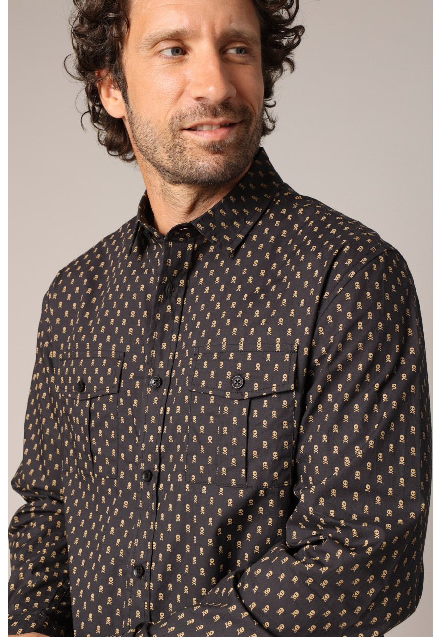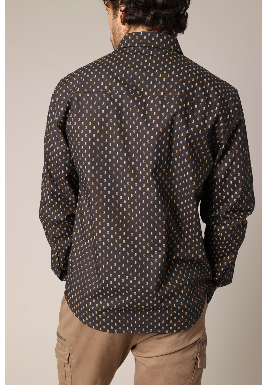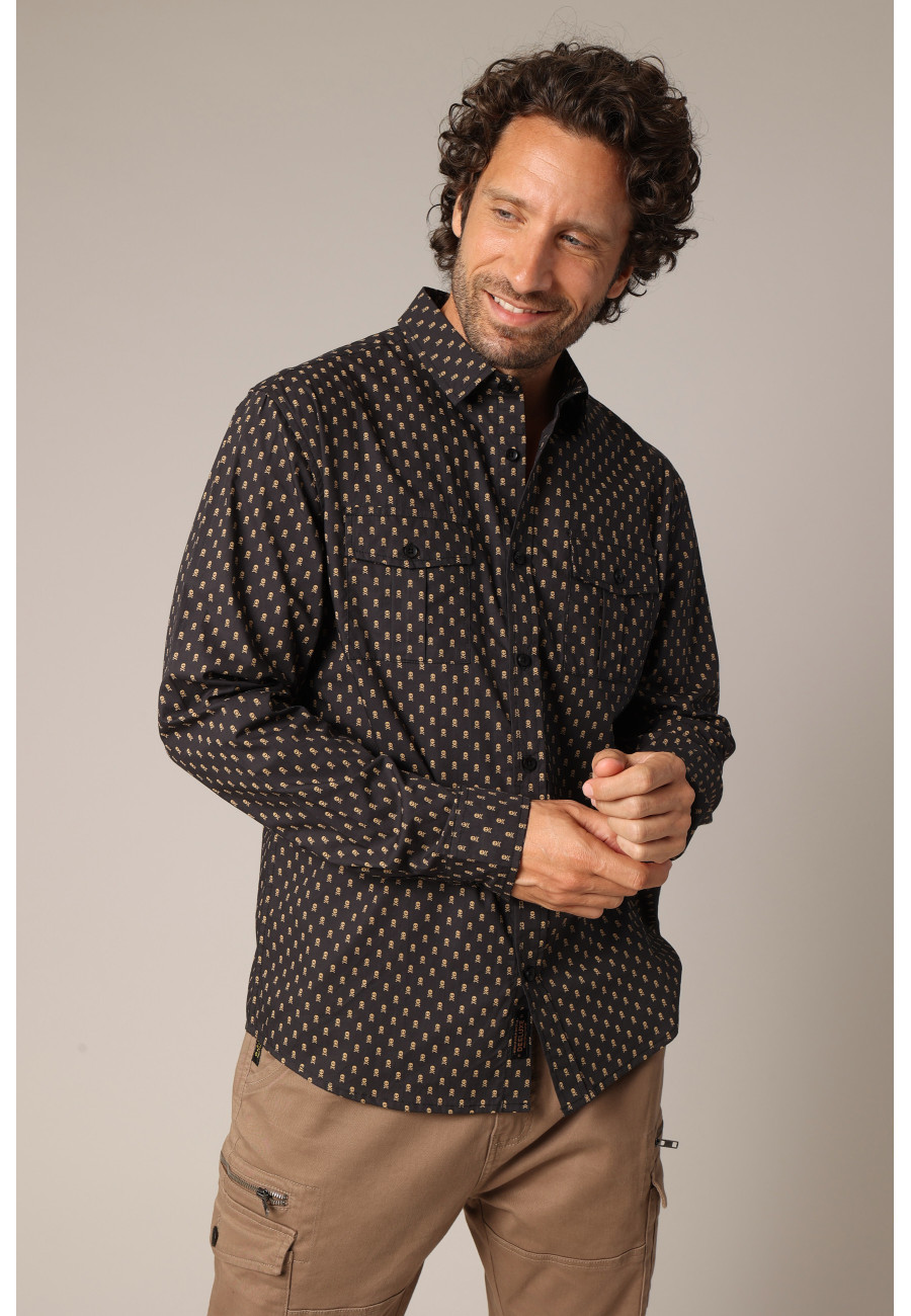 Esta camisa de manga larga luce un distintivo estampado gráfico con detalles dorados, que le aporta un toque de originalidad sin ser excesiva. Con cuello clásico y dos bolsillos en el pecho con solapa y botón, luce un estilo urbano e informal a la vez. Su corte recto sienta bien a todo tipo de cuerpos y se puede llevar por dentro o como sobrecamisa. Este estilo es fácil de combinar con un look casual chic, ya sea con chinos o vaqueros.