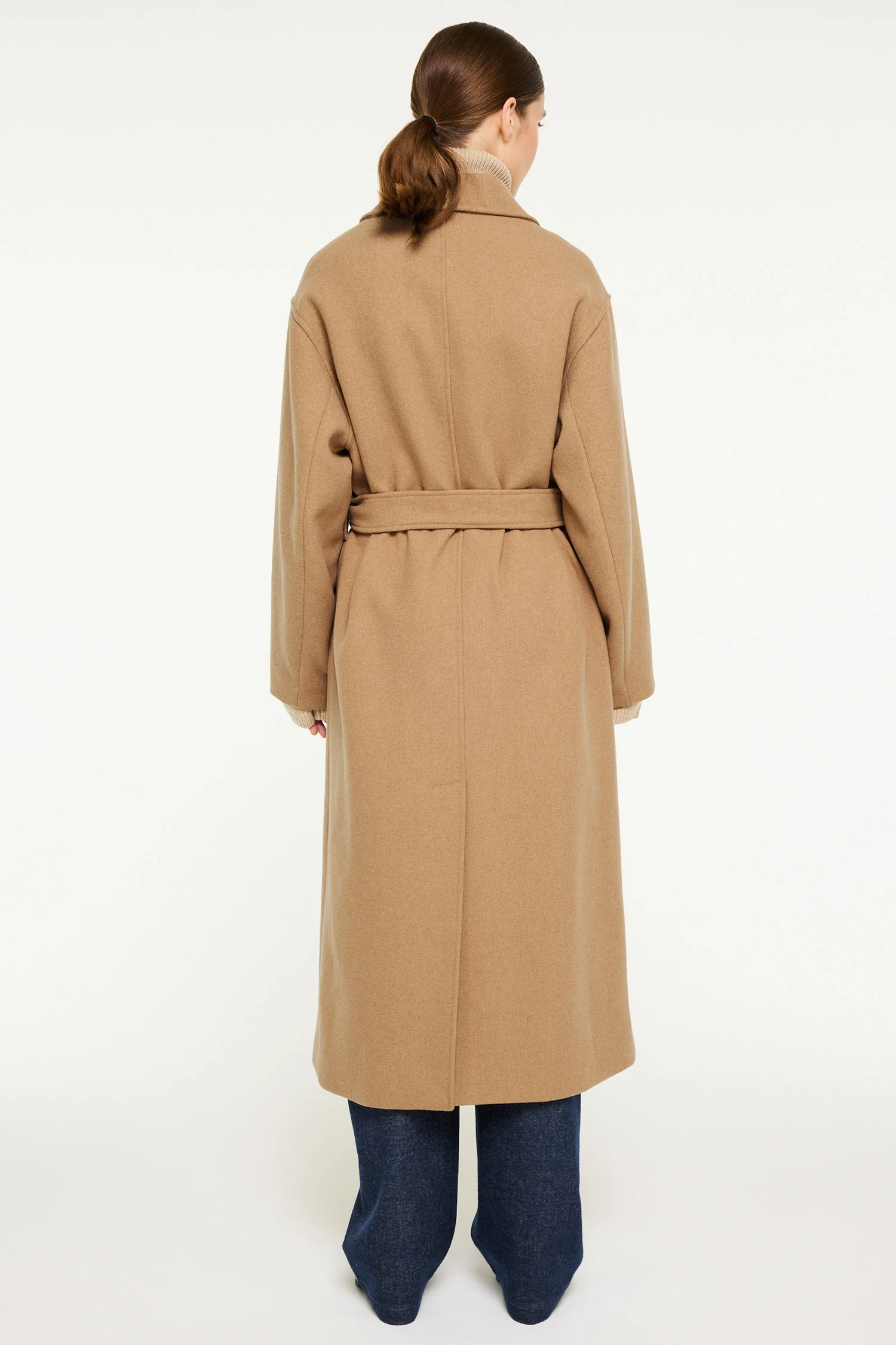 Milleah es un abrigo largo de sarga de lana con cinturón y cierre cruzado. Se puede llevar abierto o cerrado con cuello alto: una prenda elegante con un volumen generoso y una caída natural. La modelo mide 173 cm y lleva una talla S.