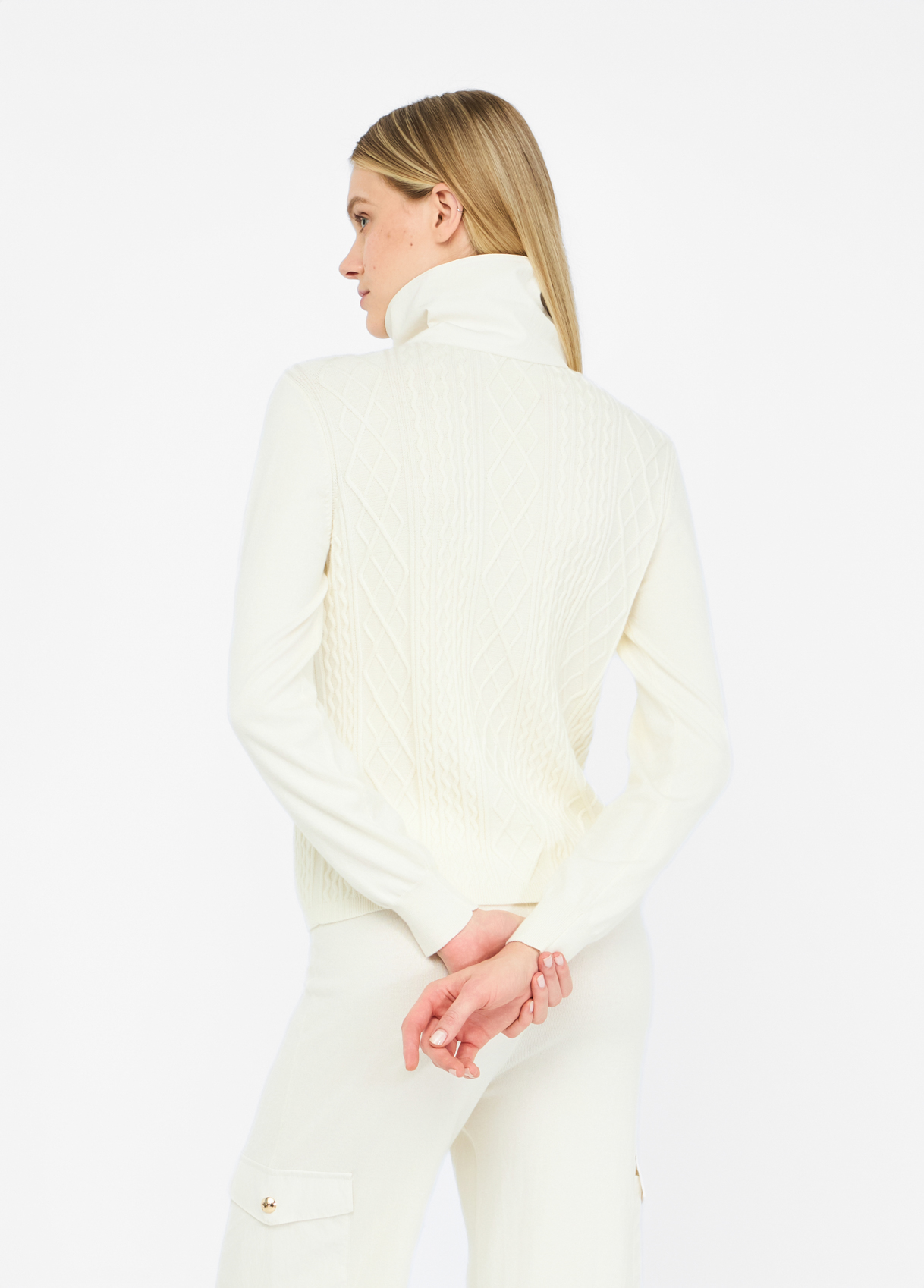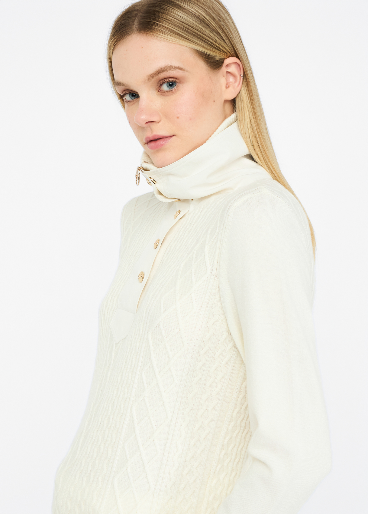 • Cuello alto con cremallera y botones a presión