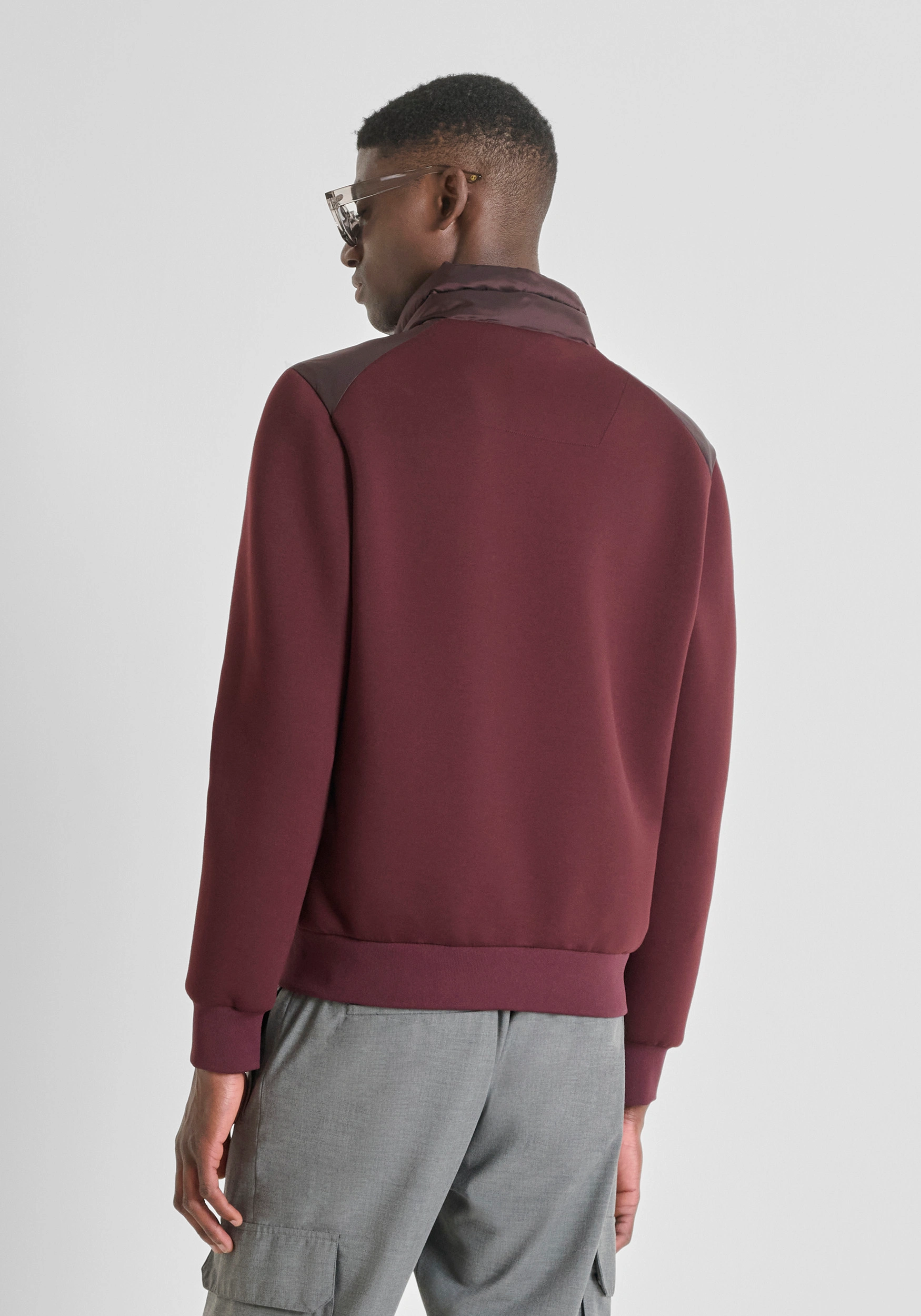 Chaqueta de plumón de corte entallado, confeccionada en nailon brillante. Este tejido le confiere resistencia y versatilidad, tanto estética como funcional. Su característica especial son las mangas en contraste, confeccionadas en punto elástico de neopreno. Cierre frontal con cremallera de doble cursor y dos bolsillos laterales con cremallera. Logotipo de parche aplicado en la parte delantera.