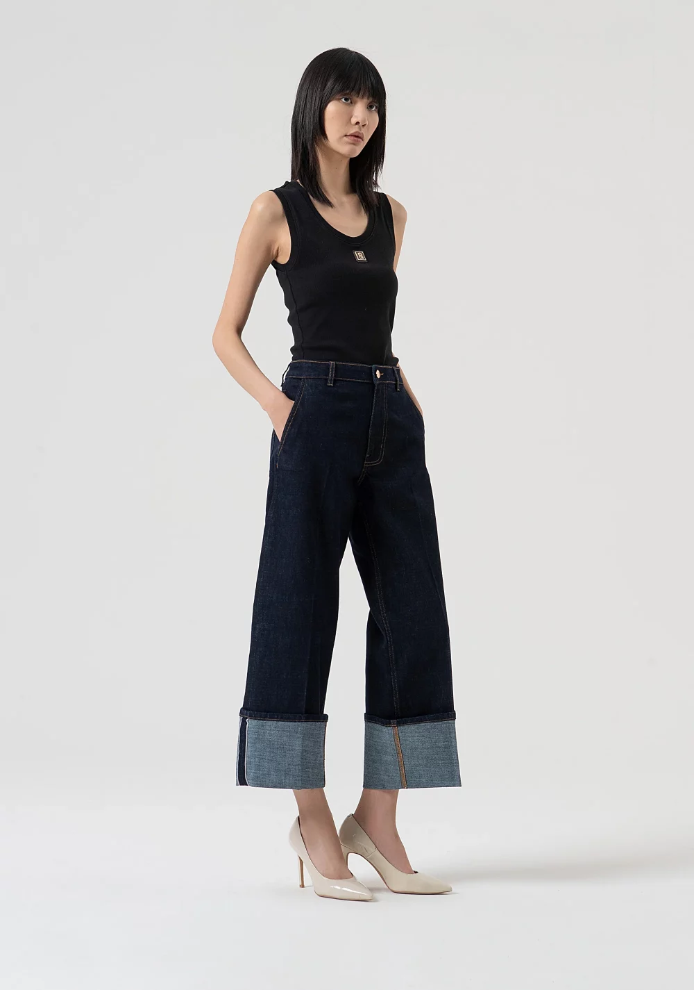 Vaqueros acampanados cropped denim con lavado oscuro. Bolsillos franceses y bajo vuelto.
