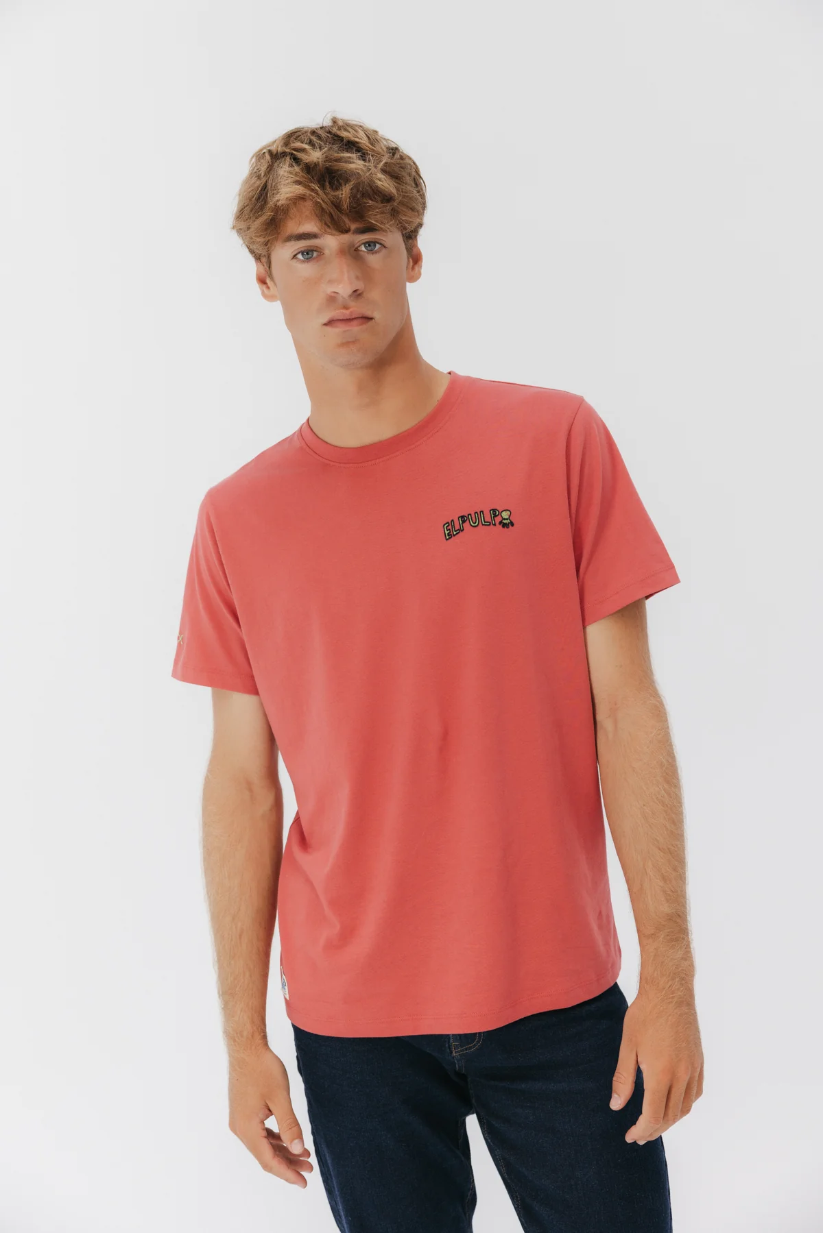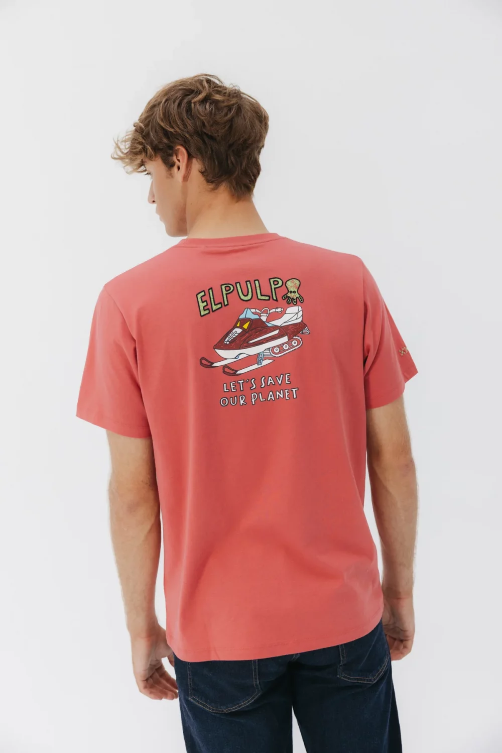 Camiseta manga corta confeccionada en 100% algodón orgánico en color rojo delavé. Logo en pecho y print trasero Let’s save our planet. Regular fit y cuello redondo. Detalle cruces bordadas a contraste en la manga.