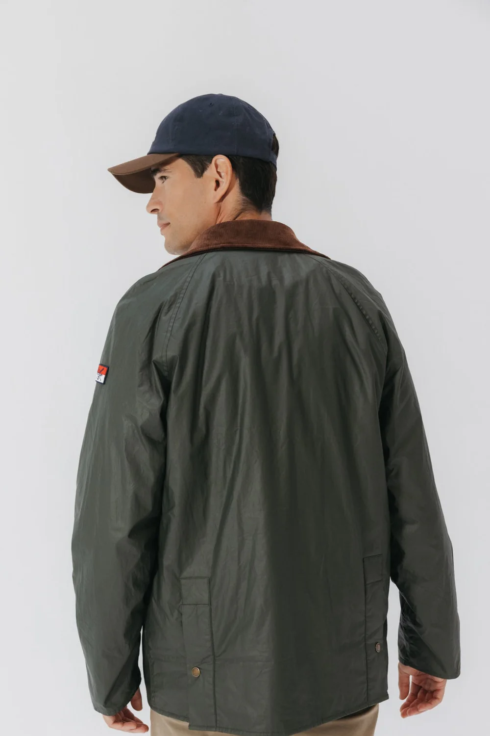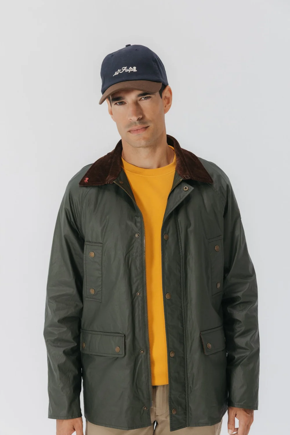 Chaqueta encerada en tono verde militar confeccionado en algodón y poliéster. Cuello a contraste efecto pana en color marrón chocolate con pin de elPulpo en color rojo. Bolsillos delanteros. Parche elPulpo en manga izquierda. Forro en tejido de cuadros y bolsillos interiores.