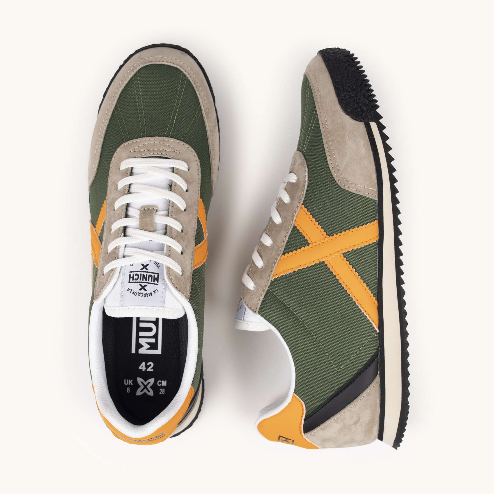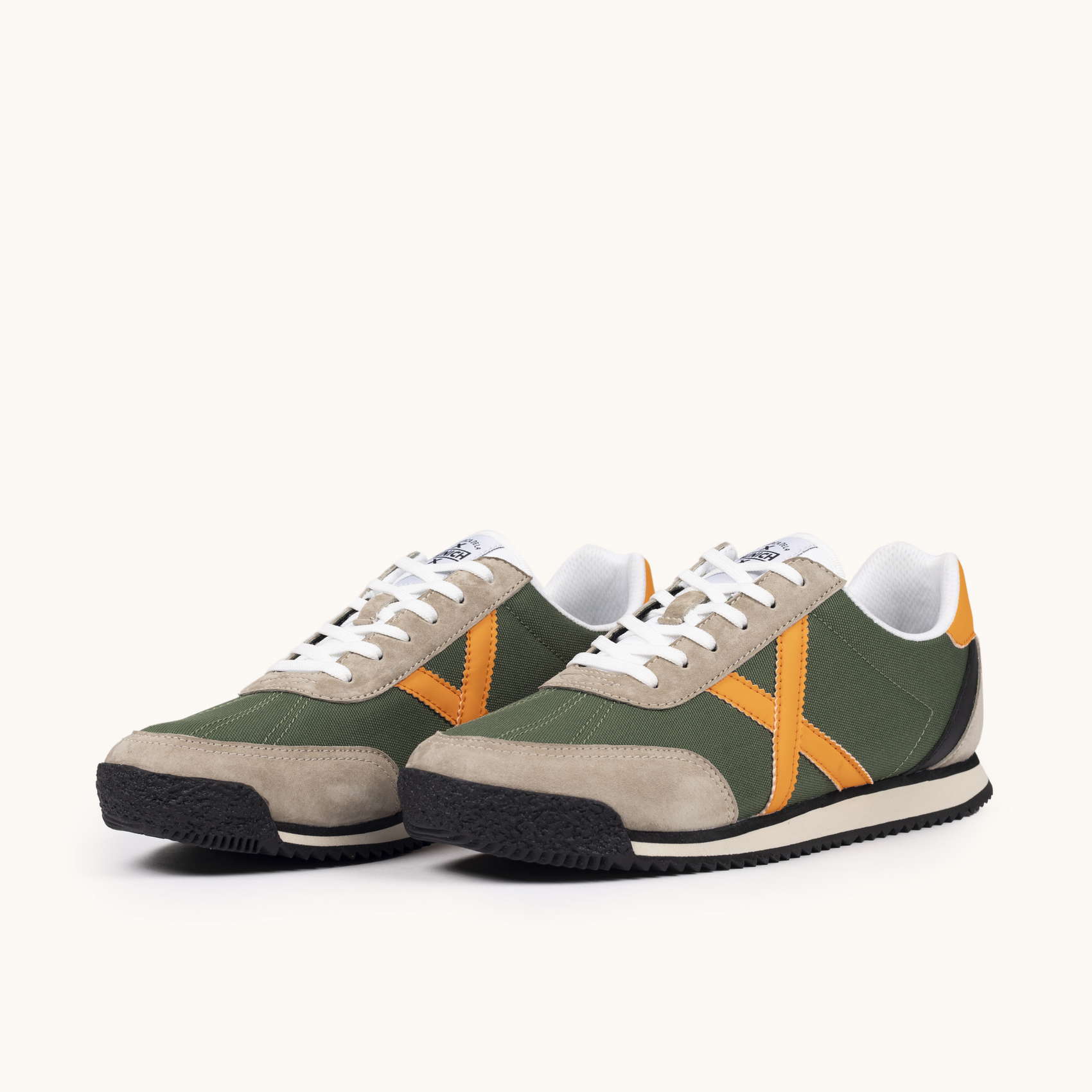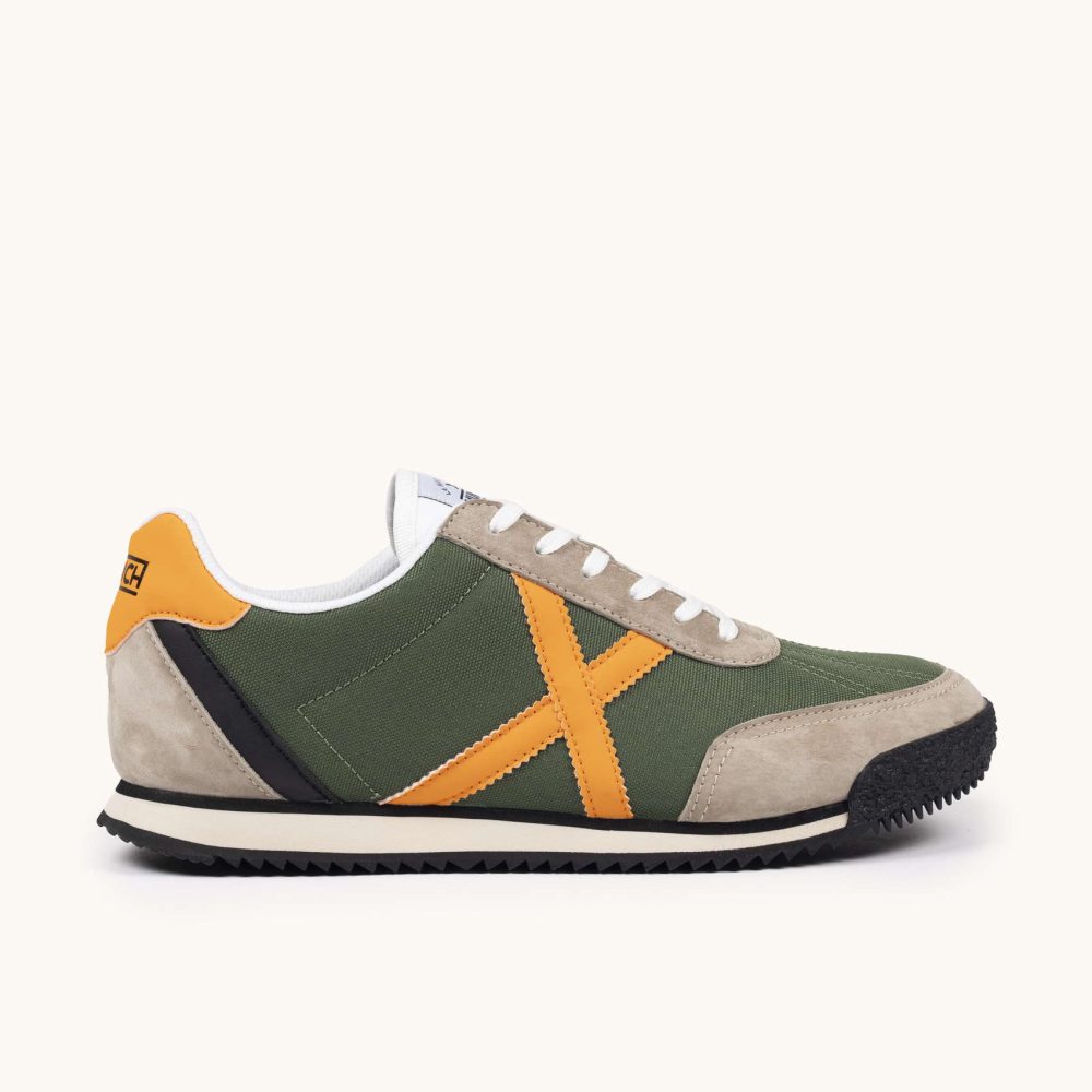 Estas deportivas capturan la estética aventurera y retro mediante una combinación cromática orgánica que destaca en cualquier entorno. El cuerpo principal está confeccionado en un resistente tejido técnico verde caqui, reforzado con piezas de serraje en un suave tono tierra y rematado con la distintiva cruz lateral en un naranja vibrante que coordina con el estabilizador del talón. Gracias a su entresuela de EVA ligera y la suela exterior dentada de goma negra, este modelo proporciona una amortiguación superior y un agarre firme, siendo la elección ideal para quienes buscan un calzado todoterreno con un diseño clásico para sus desplazamientos urbanos diarios.