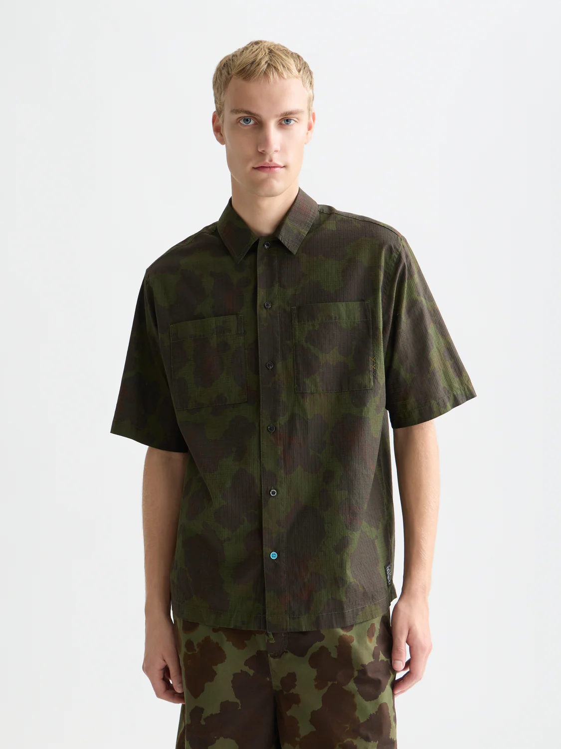 Camisa estampada de algodón ripstop con corte holgado y bolsillos en el pecho, que le da un aspecto moderno y funcional.