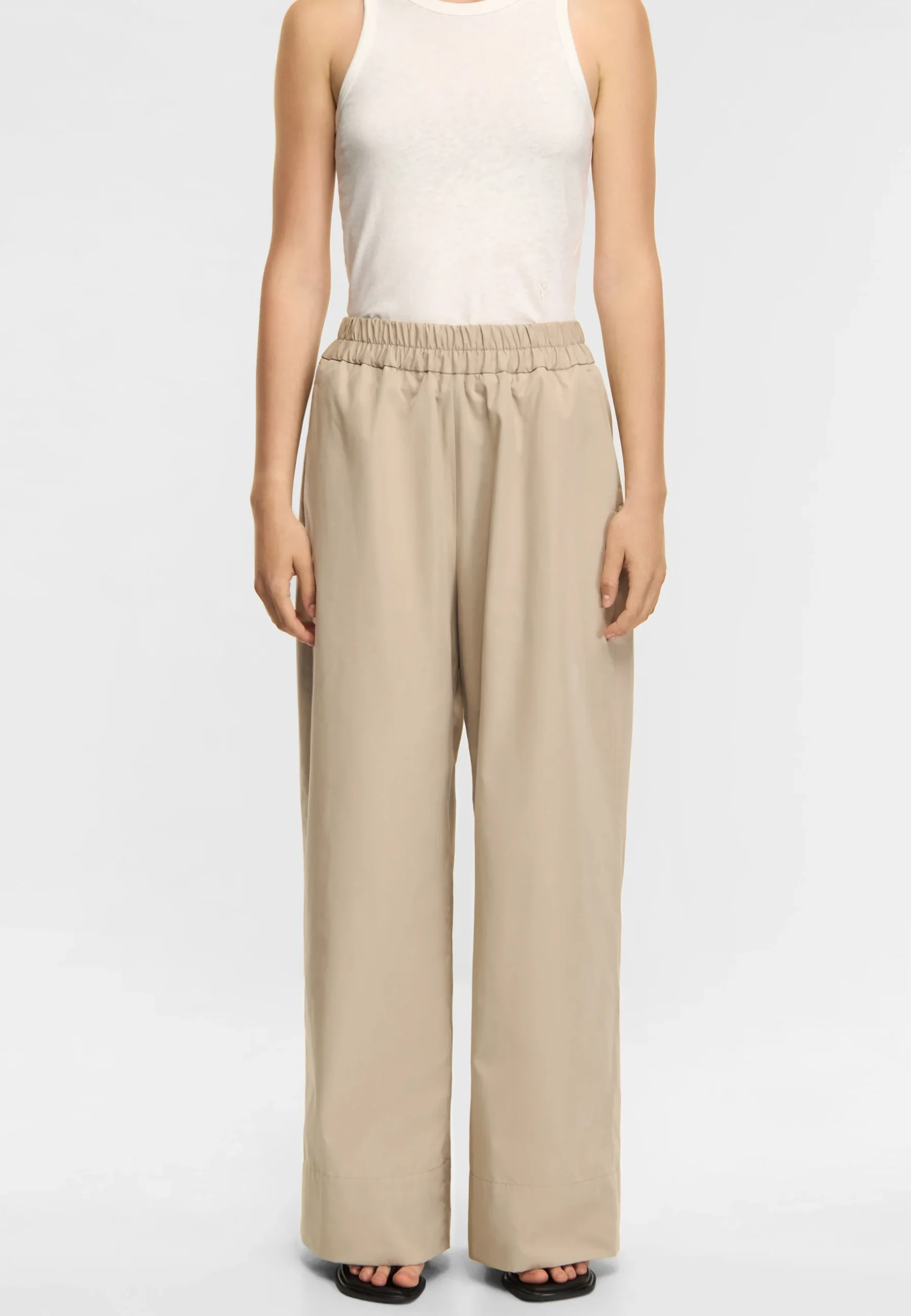 Saralee es un pantalón confeccionado en popelina transparente, un tejido de algodón fresco y fresco con una superficie impecable. La pernera ancha y la cintura alta crean una silueta relajada y elegante. Perfecto para combinar con Noelle y lograr un look ligero y sofisticado.