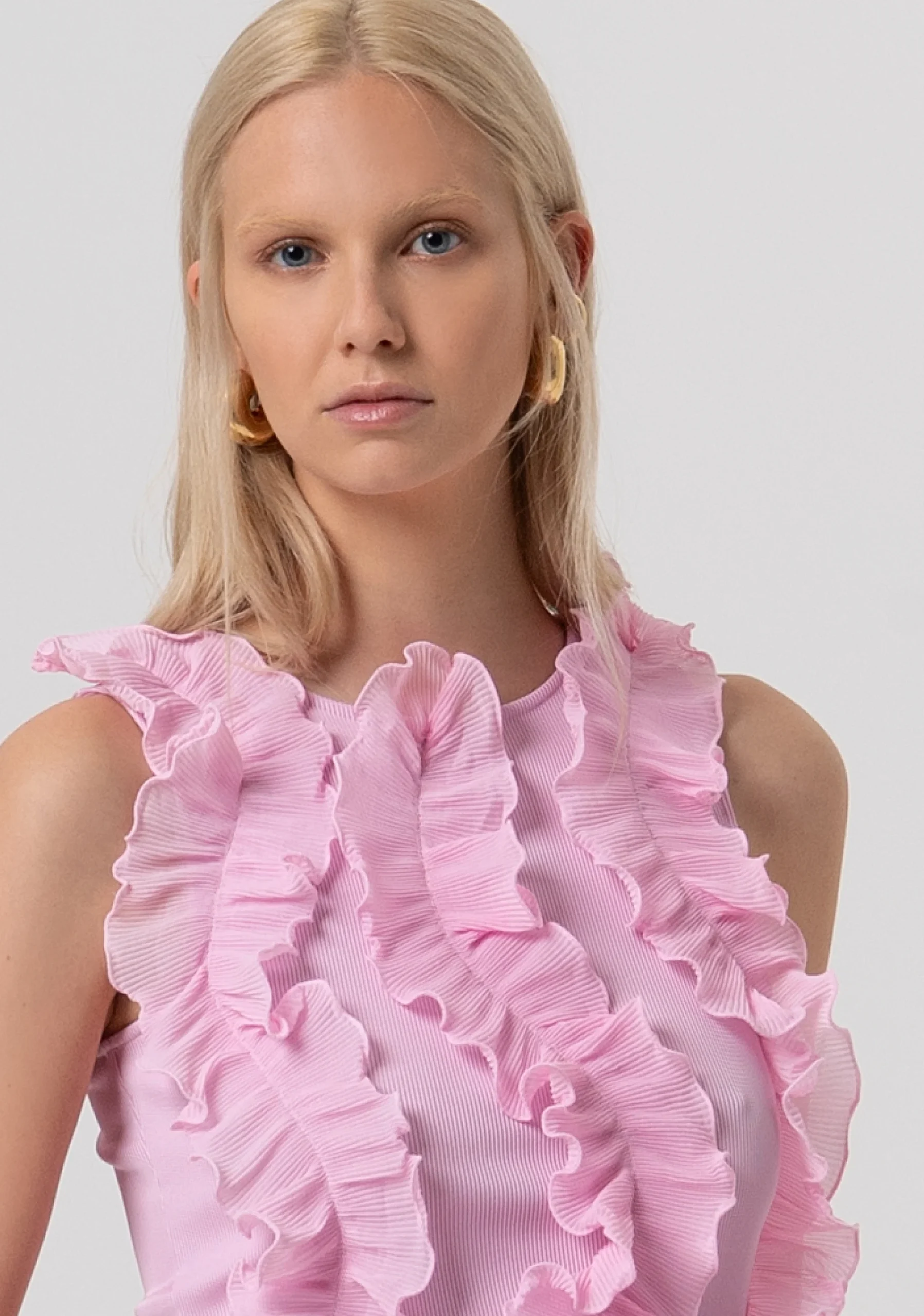 Top sin mangas con volantes, confeccionado en georgette. Cuello redondo y abertura en forma de lágrima en la espalda.