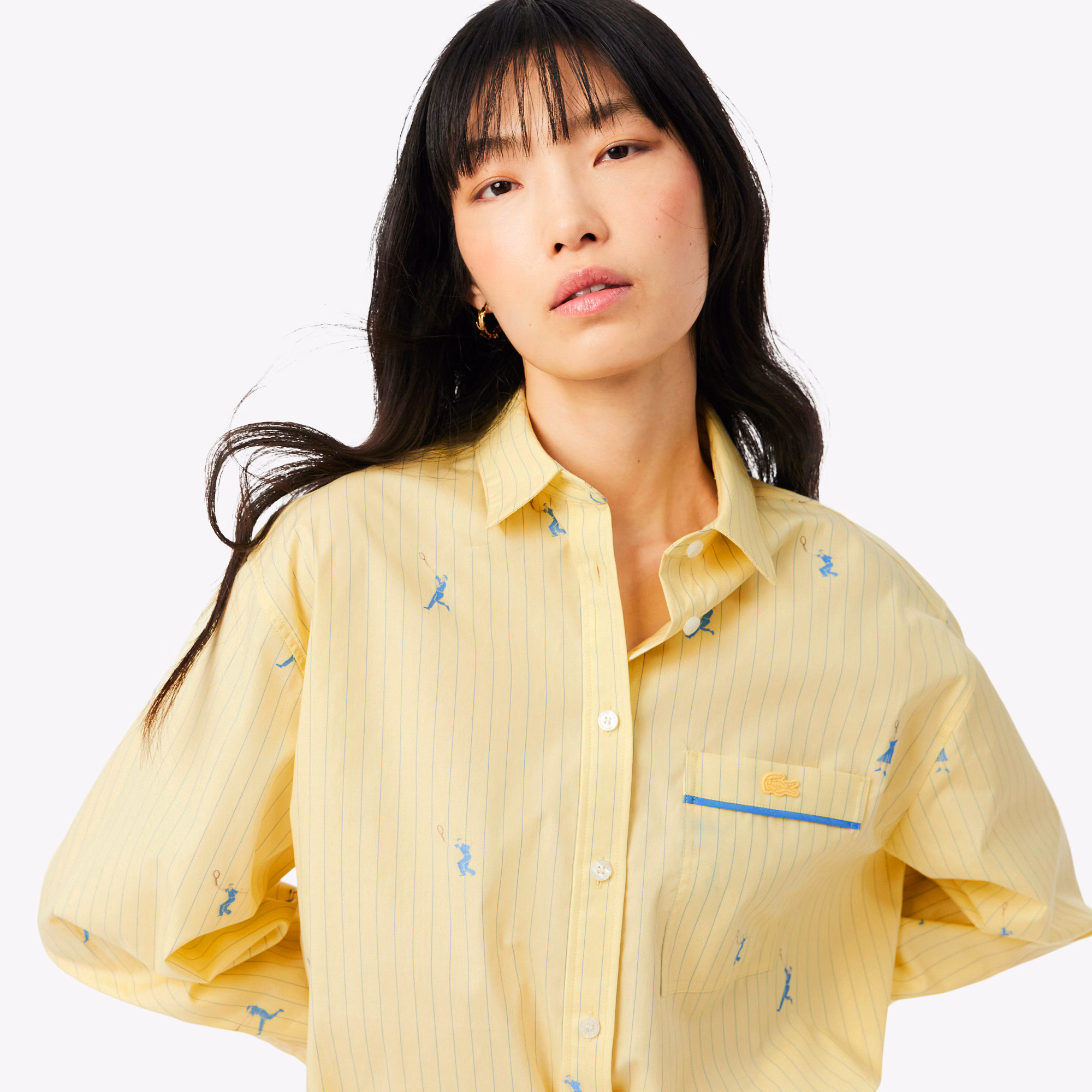 Esta camisa de Lacoste, hogar de la elegancia a la francesa desde 1933, posee un estilo tan audaz como gráfico. Asocia un diseño amplio realizado en popelín de algodón con un estampado de rayas finas y jugadores de tenis en toda la prenda. Una prenda original que se completa con un sutil ribete en contraste y un exclusivo cocodrilo bordado.