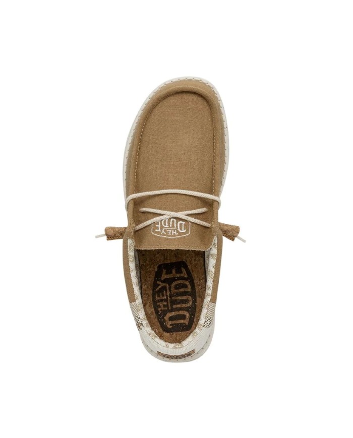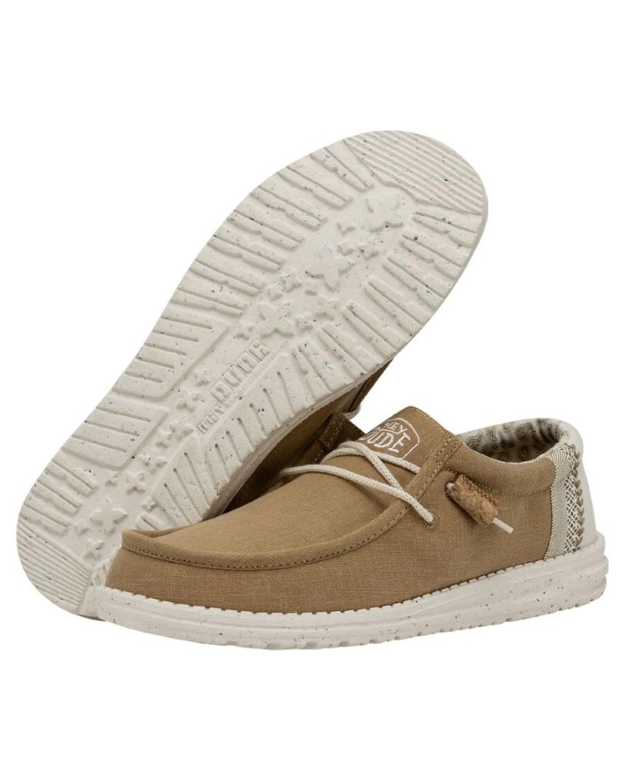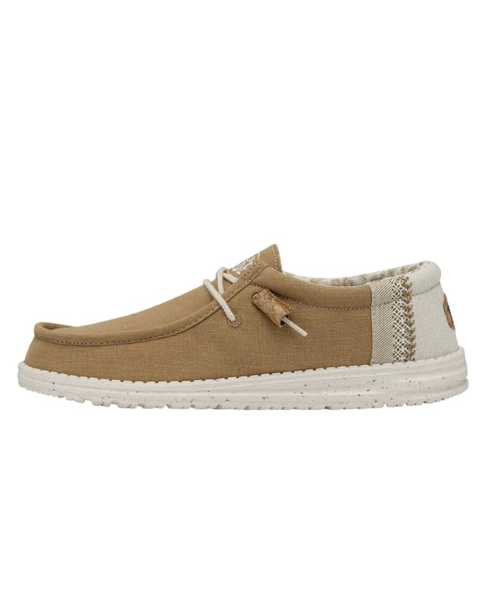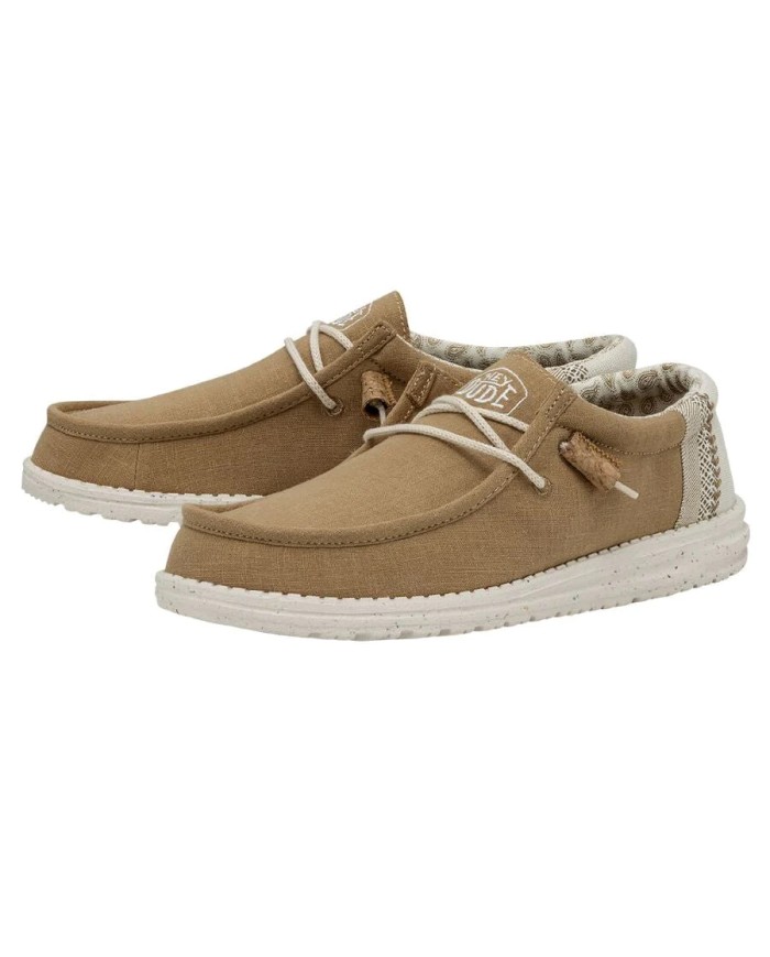 Zapatillas de cordones de la firma Hey Dude, fabricada con materiales de buena calidad. Toda de tela lisa, disponible en tres tonos (azul,kaki y beige). Ambas con adornos en el talón y forro de tela suave, transpirable y estampado.
