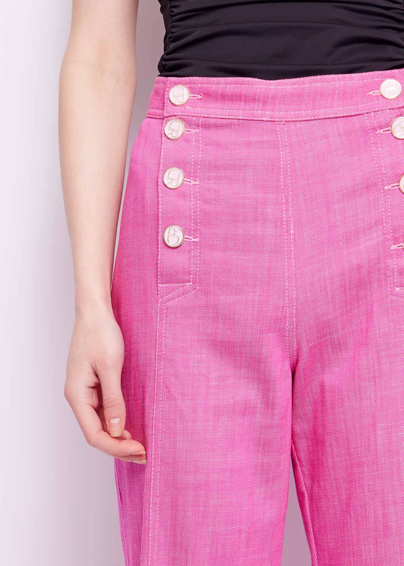 Pantalón de algodón con pliegue cosido en la parte delantera. Con botones de logotipo en la parte delantera.