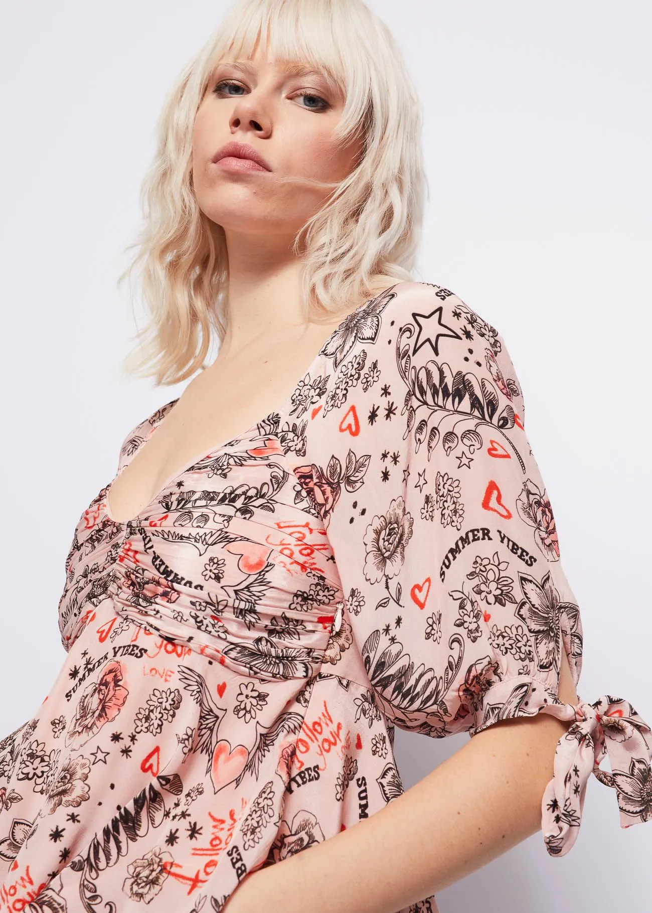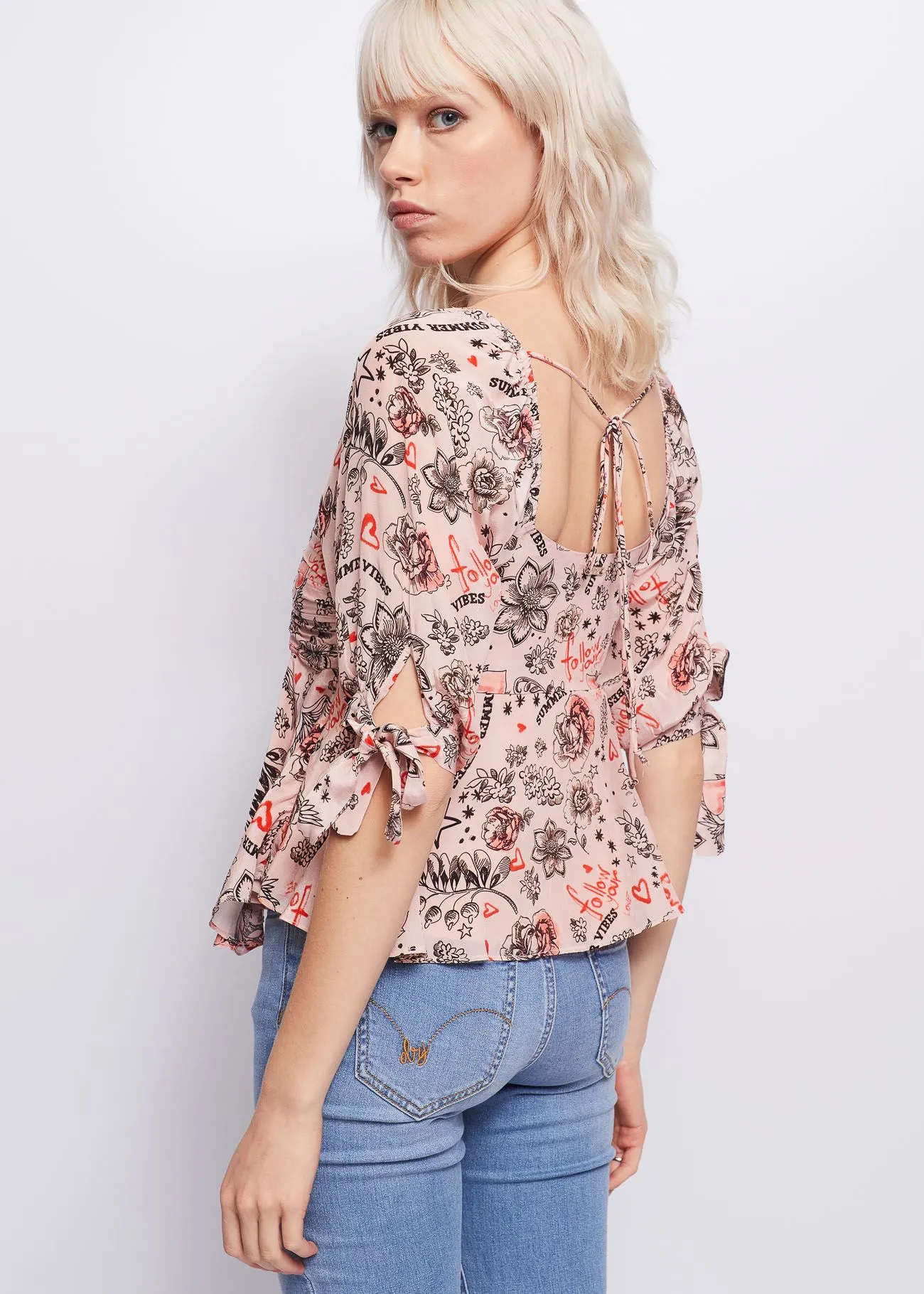 Blusa estilo imperio en raso de viscosa con estampado all over inspirado en tattoo. Con escote corazón con lazo en la espalda, manga tres cuartos y logo metálico en la espalda. Forro de viscosa. Tejido 100% Viscosa Forro 100% Viscosa
