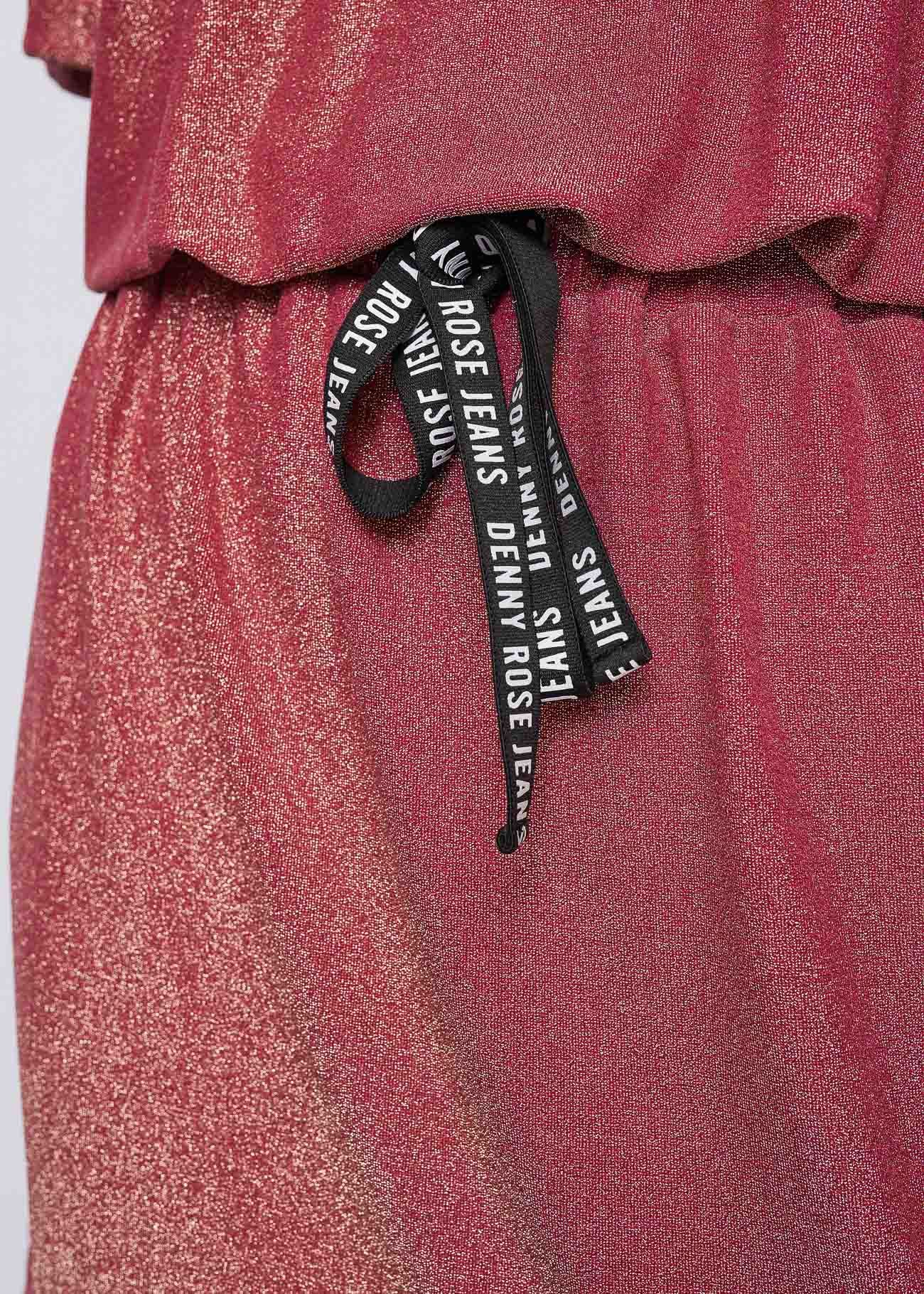 Vestido corto en tejido elástico y lurex. Con cuello redondo, manga corta con vuelta en los puños y cordón elástico con logo en la cintura. Logotipo metálico en la parte trasera.