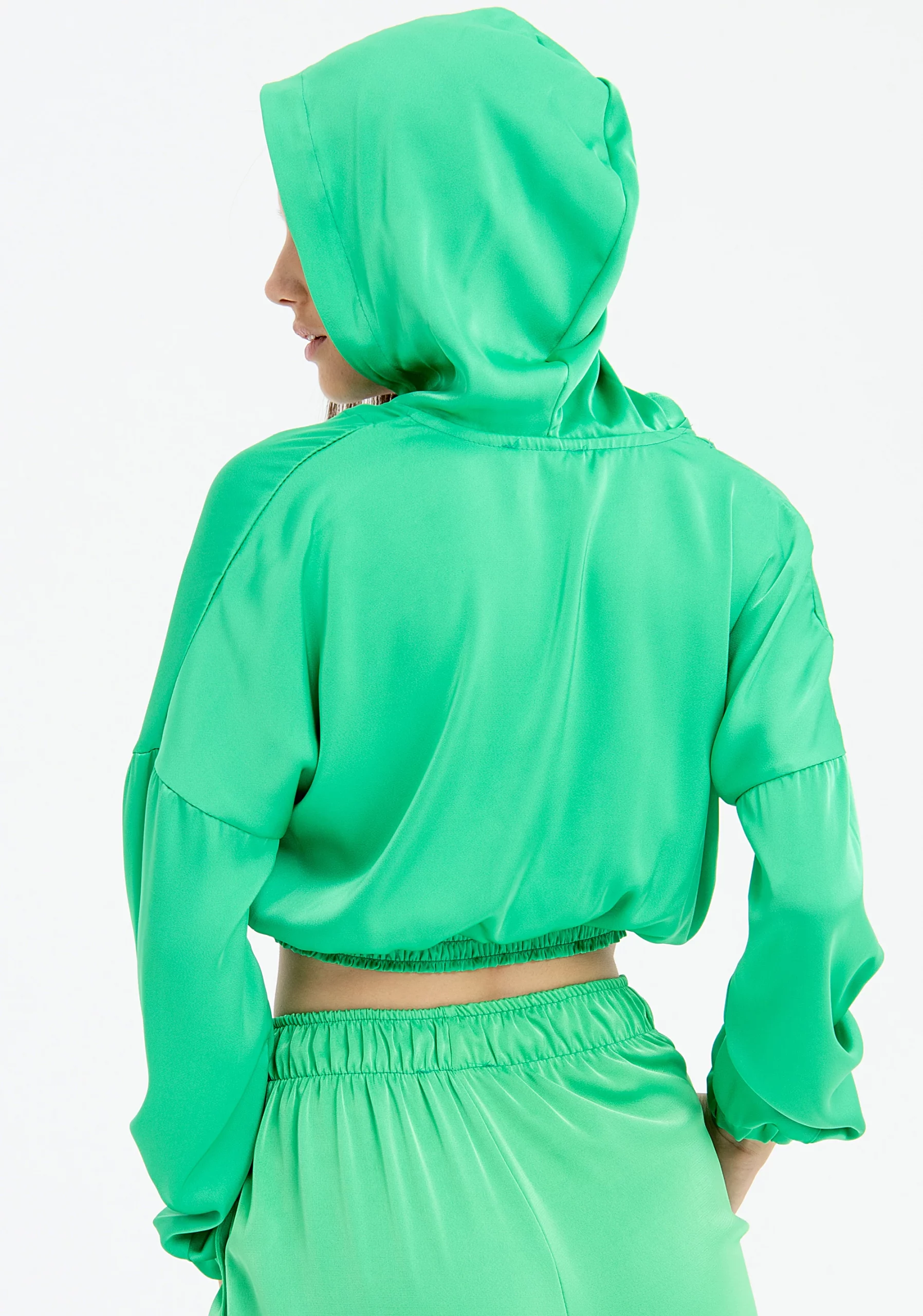 Blusa cropped confeccionada en raso con capucha. Cuello cruzado cruzado y manga larga.