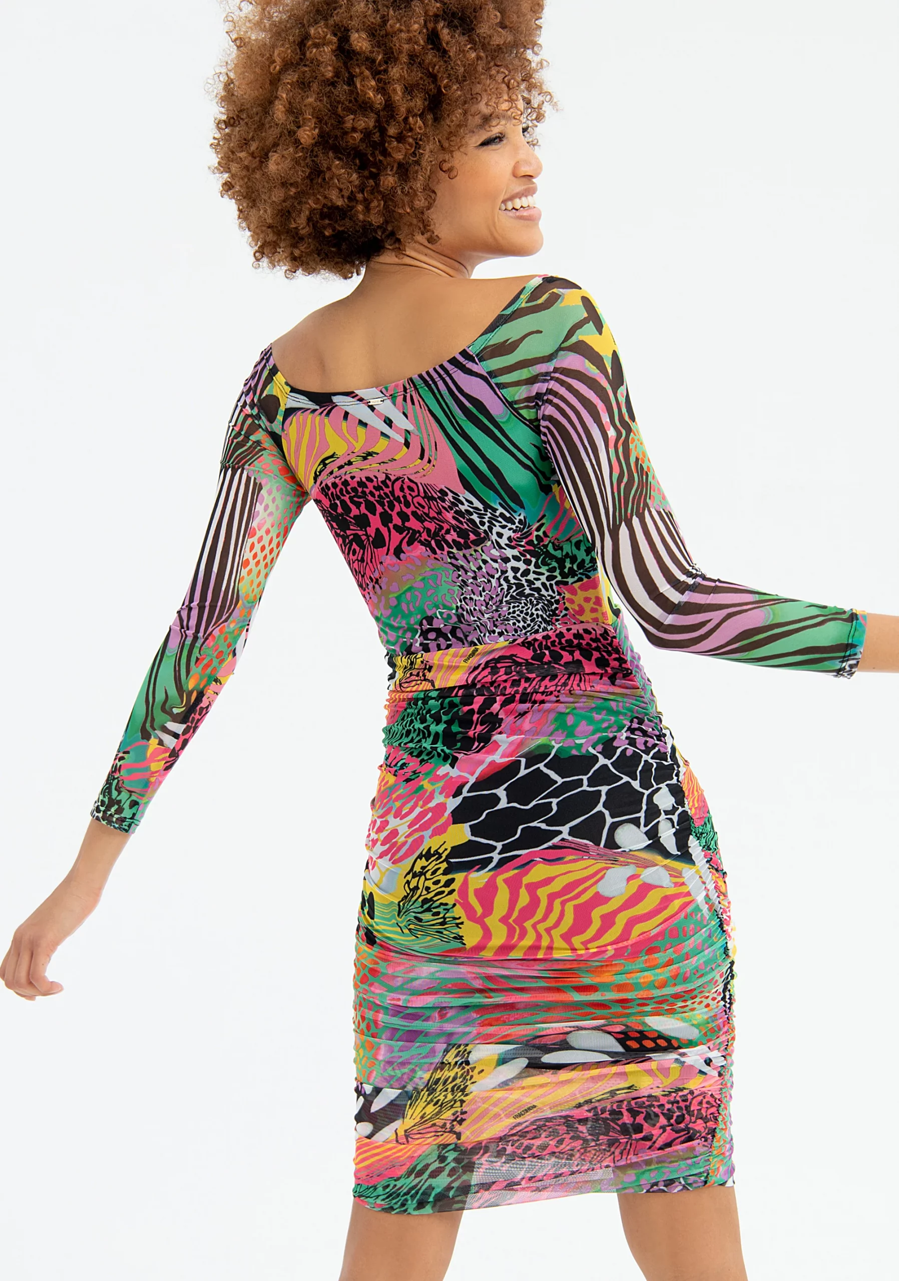 Vestido slim fit con estampado multicolor. Cuello en V estilo bardot y manga larga.