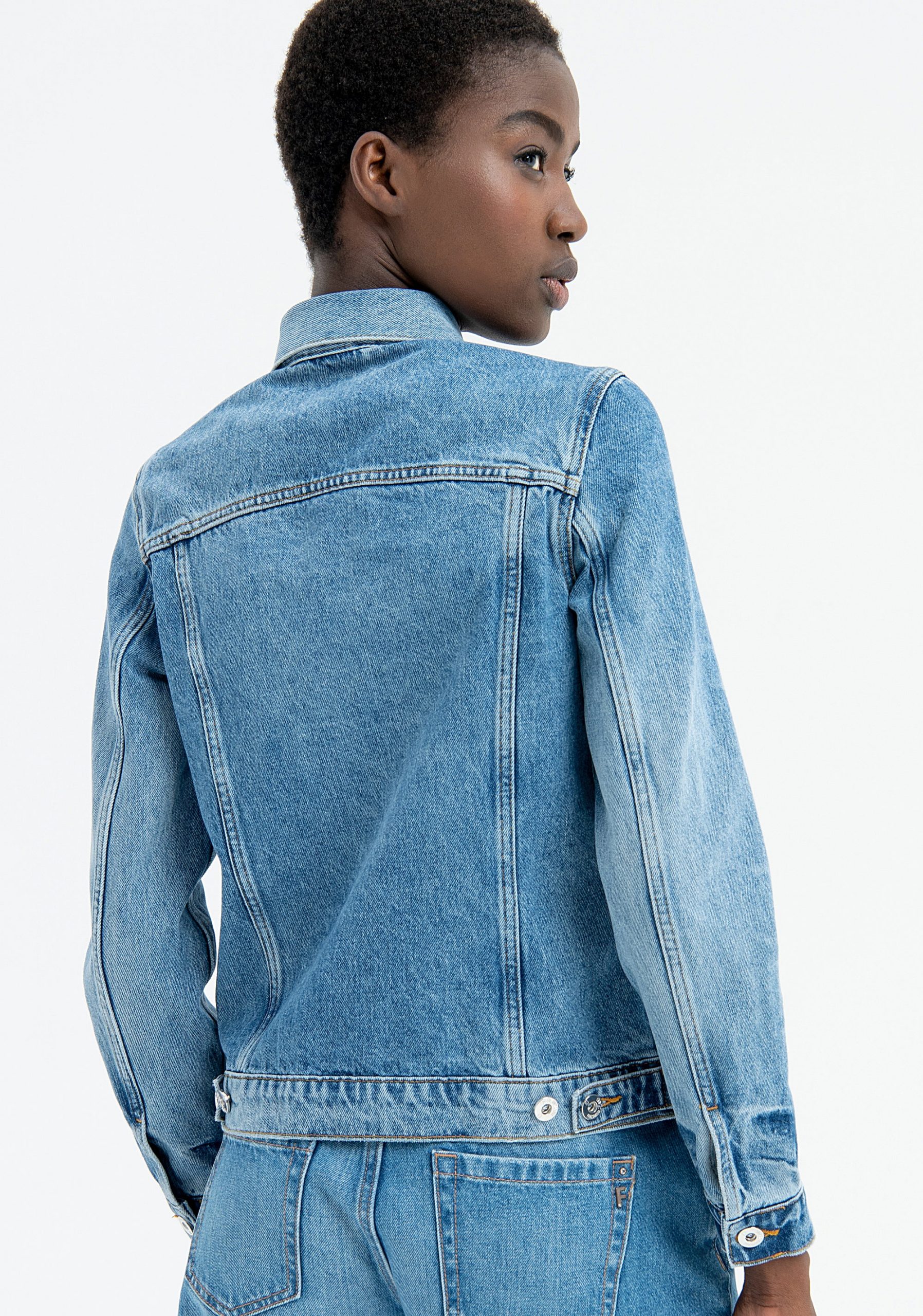 Chaqueta regular fit confeccionada en denim con lavado medio. Cuello de corte clásico, botones delanteros para abertura, cadenas de strass en los hombros y manga larga