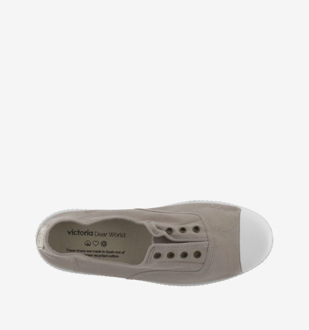 Inglesa clásica victoria. Zapatillas de lona nude para mujer sin cordones. Fabricada en España con lona de algodón reciclado DREC® (Dyeable Recycled Eco Cotton) y suela de caucho natural vulcanizado con puntera de goma. Con elástico suave en el empeine que facilita el calce. Uno de los modelos más versátiles, ecológicos, ligeros y fáciles de lavar. Incluye una plantilla interior extraíble para mayor confort.
