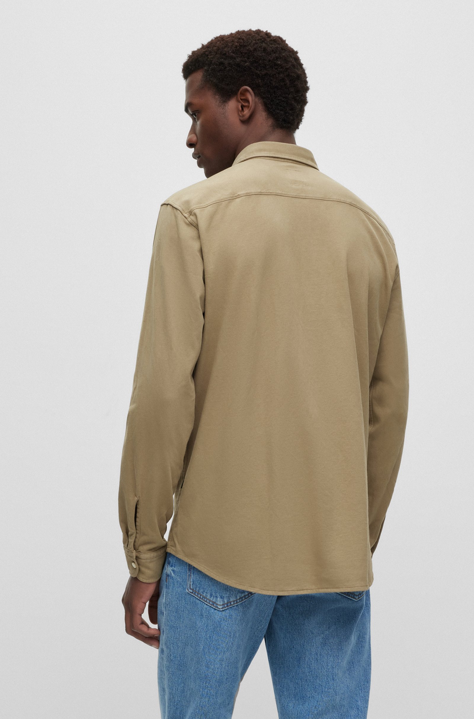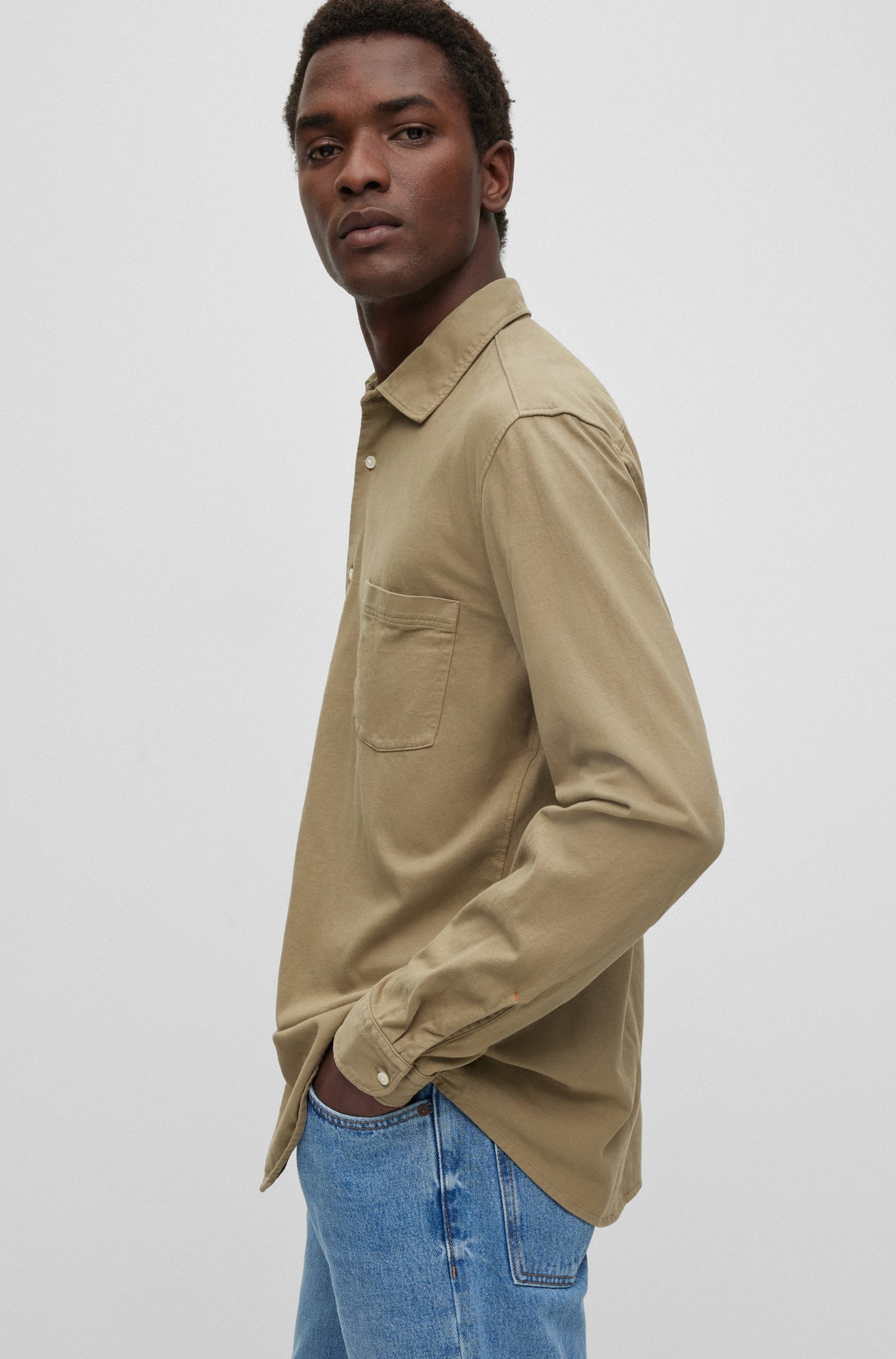 Una camisa ajustada BOSS Hombre de punto de algodón suave con botones de goma, detalles de la marca y acabado teñido en prenda que crea un efecto irregular.